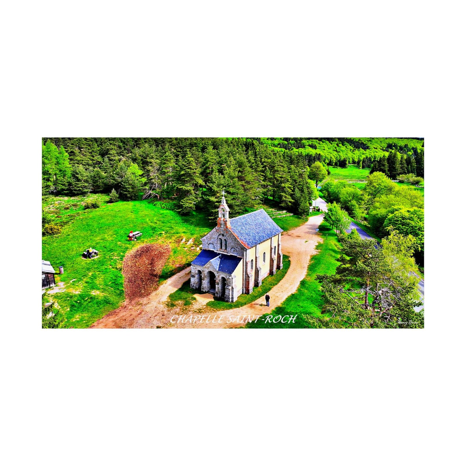 Sur les hauteurs verdoyantes près de Lajo, la Chapelle Saint-Roch se dresse comme un havre de paix au cœur de la Margeride. Depuis les airs, cette petite église offre une vision saisissante : un îlot spirituel entouré de forêt, baigné de lumière, où règne un calme profond.