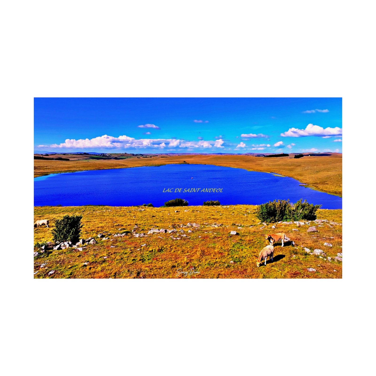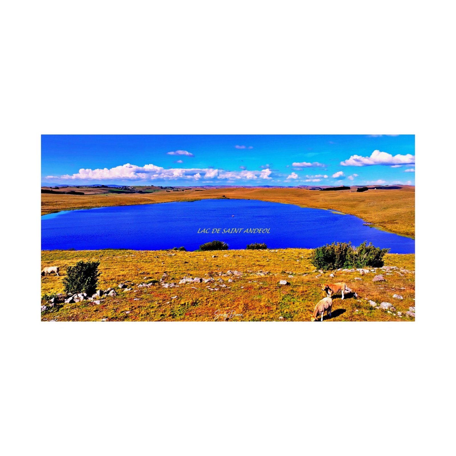 Découvrez le Lac de Saint-Andéol vu du ciel, capturé en drone sur le mythique plateau de l’Aubrac. Ce lac glaciaire, chargé de légendes et de spiritualité, révèle ici toute sa profondeur : un bleu intense entouré d’étendues dorées, de silence et de vent libre.