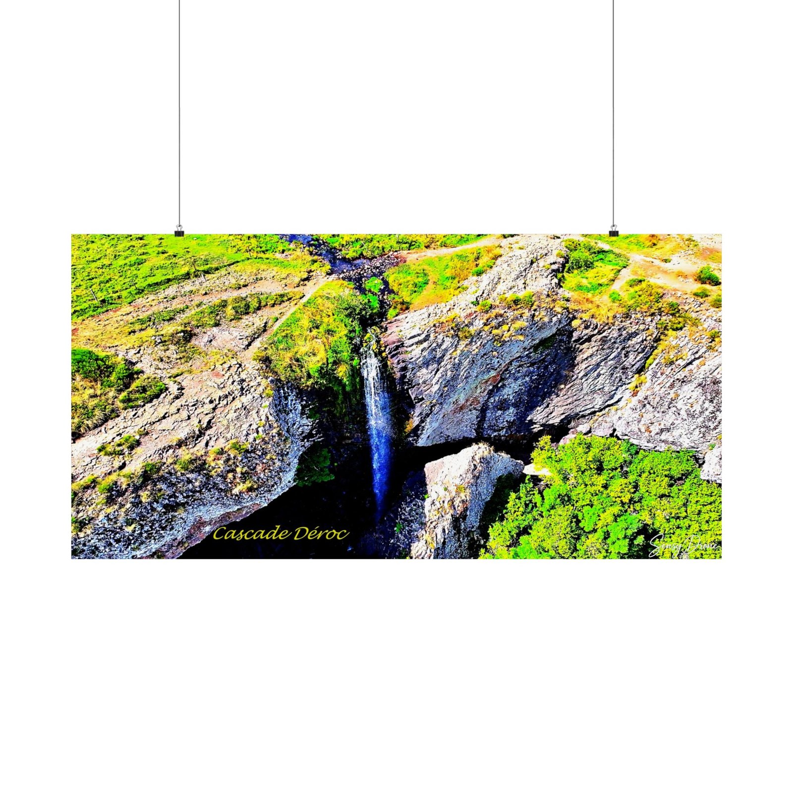 Découvrez la Cascade de Déroc vue du ciel, capturée en drone au cœur de l’Aubrac. Cette affiche révèle l’élan sauvage de la roche basaltique, les couleurs profondes du plateau et le saut lumineux de la cascade qui se jette dans son gouffre mystérieux.
