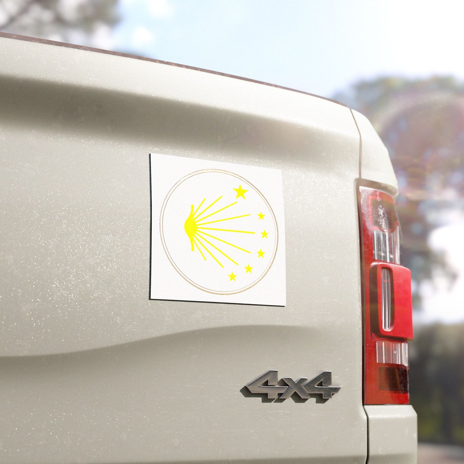 Bright, simple, and weather-ready — this vinyl car magnet carries a little burst of light wherever you go. The design pairs a soft golden sunburst with a ring of stars on a matte white base, giving a subtle, vintage-inspired look that reads clearly from a distance. Stick it to your bumper, toolbox, or cooler to add personality without shouting. Durable PVC construction and a strong magnetic backing mean it holds up through rain, road grit, and daily use, while the matte finish reduces glare and keeps the focus on the design. Comes in three sizes so you can choose a discreet accent or a bolder statement.