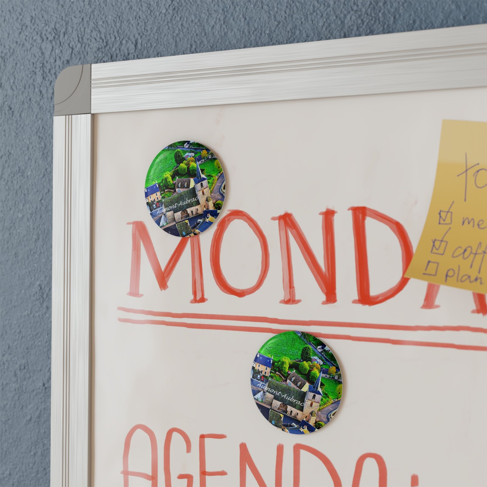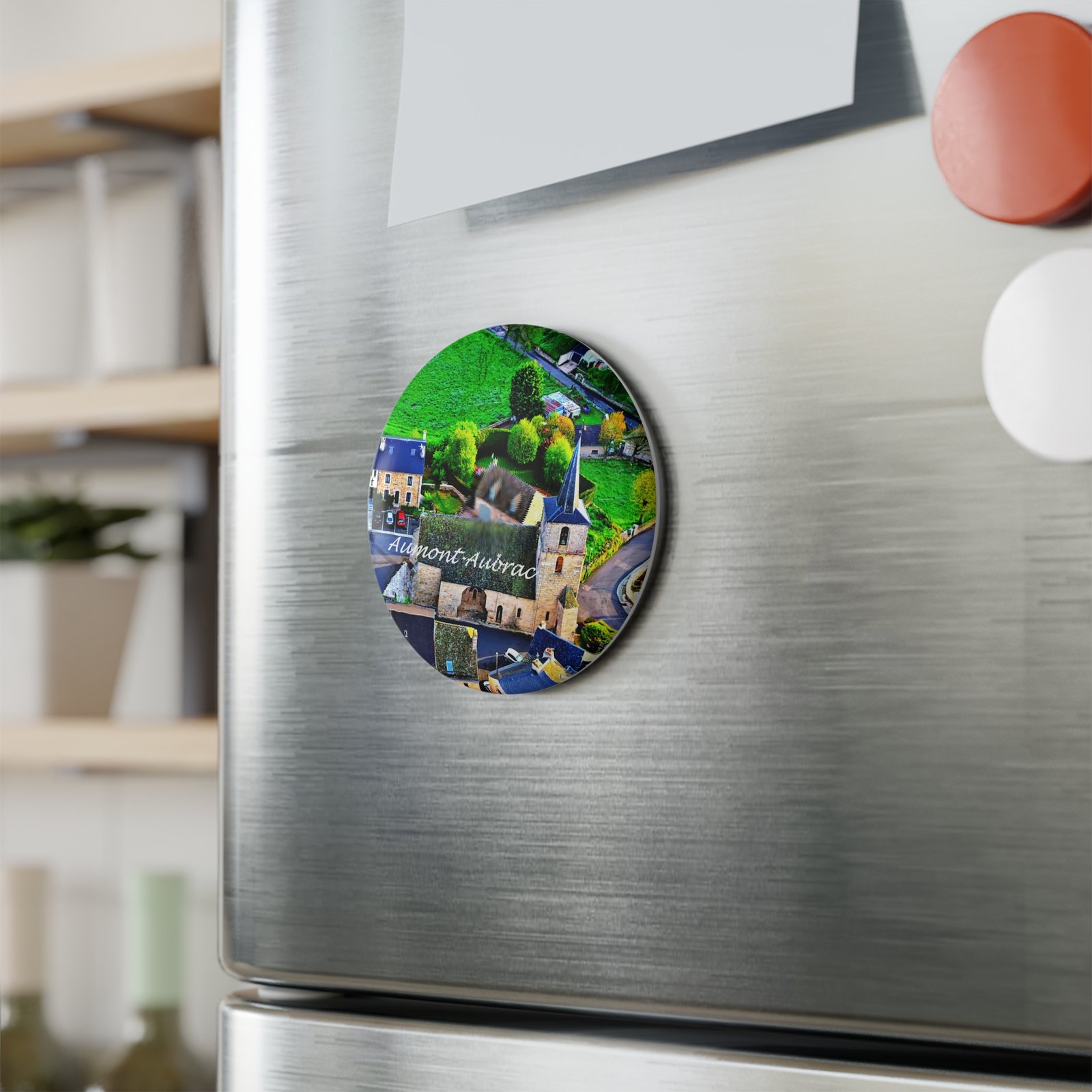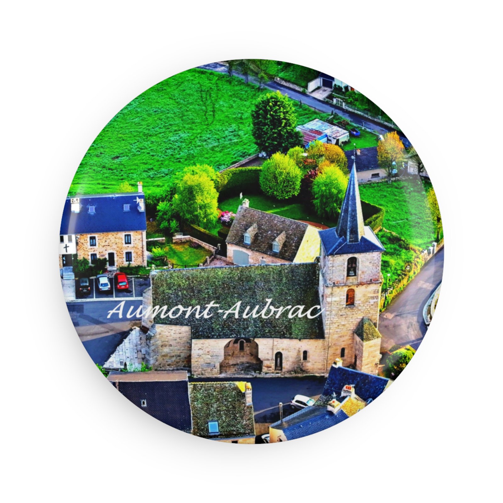 Cet aimant décoratif rond est un souvenir authentique d’Aumont-Aubrac,