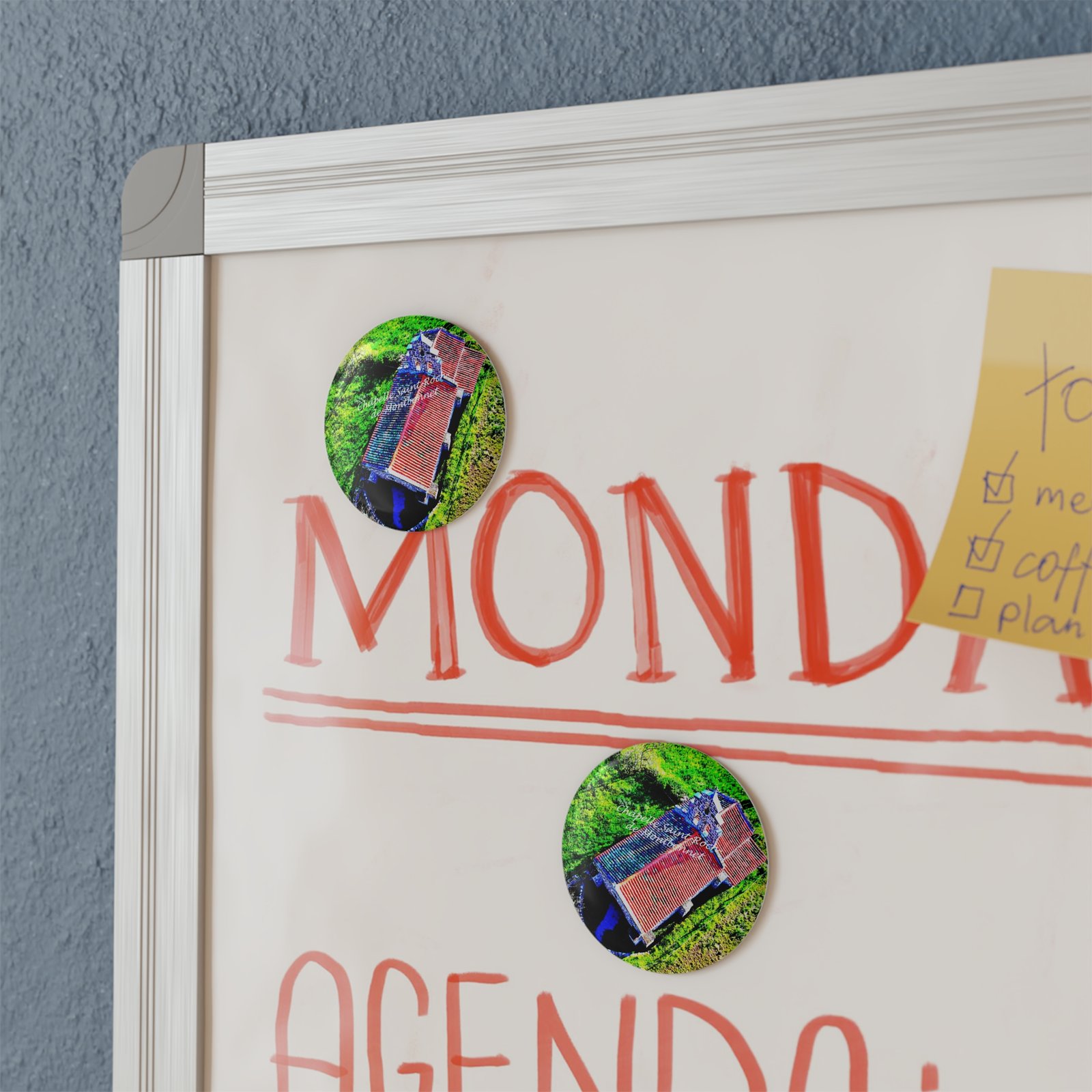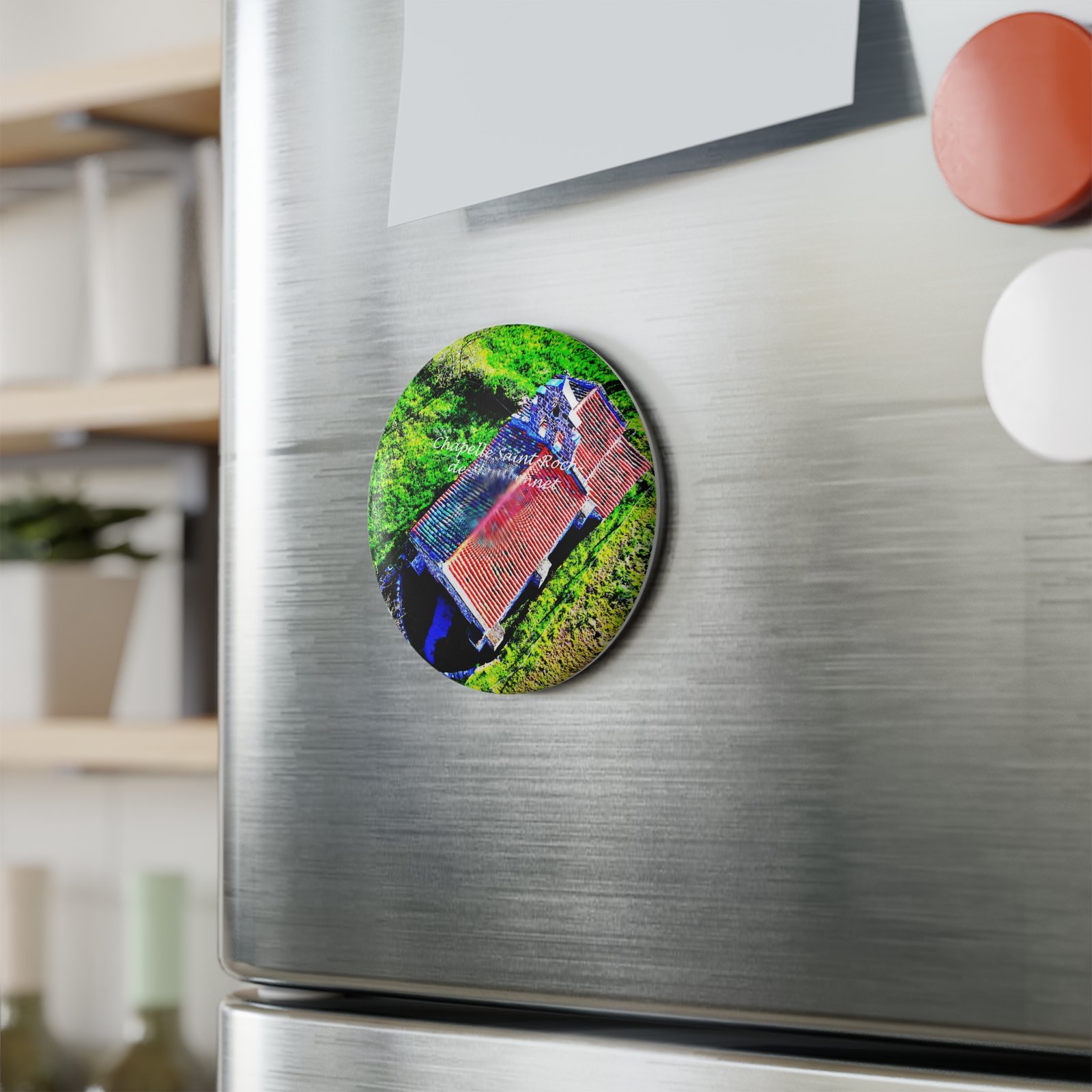 A vivid round magnet that brings a tiny landscape into your daily view. The bright, fade-resistant print captures a sunlit chapel and rolling green fields with painterly contrast, sealed under a clear mylar/UV layer to keep colors popping and protect against scratches. The slim metal shell and strong flat magnetic backing make it easy to mount on refrigerators, lockers, or any steel surface — a small, durable keepsake that tucks a peaceful countryside moment into your home routine.