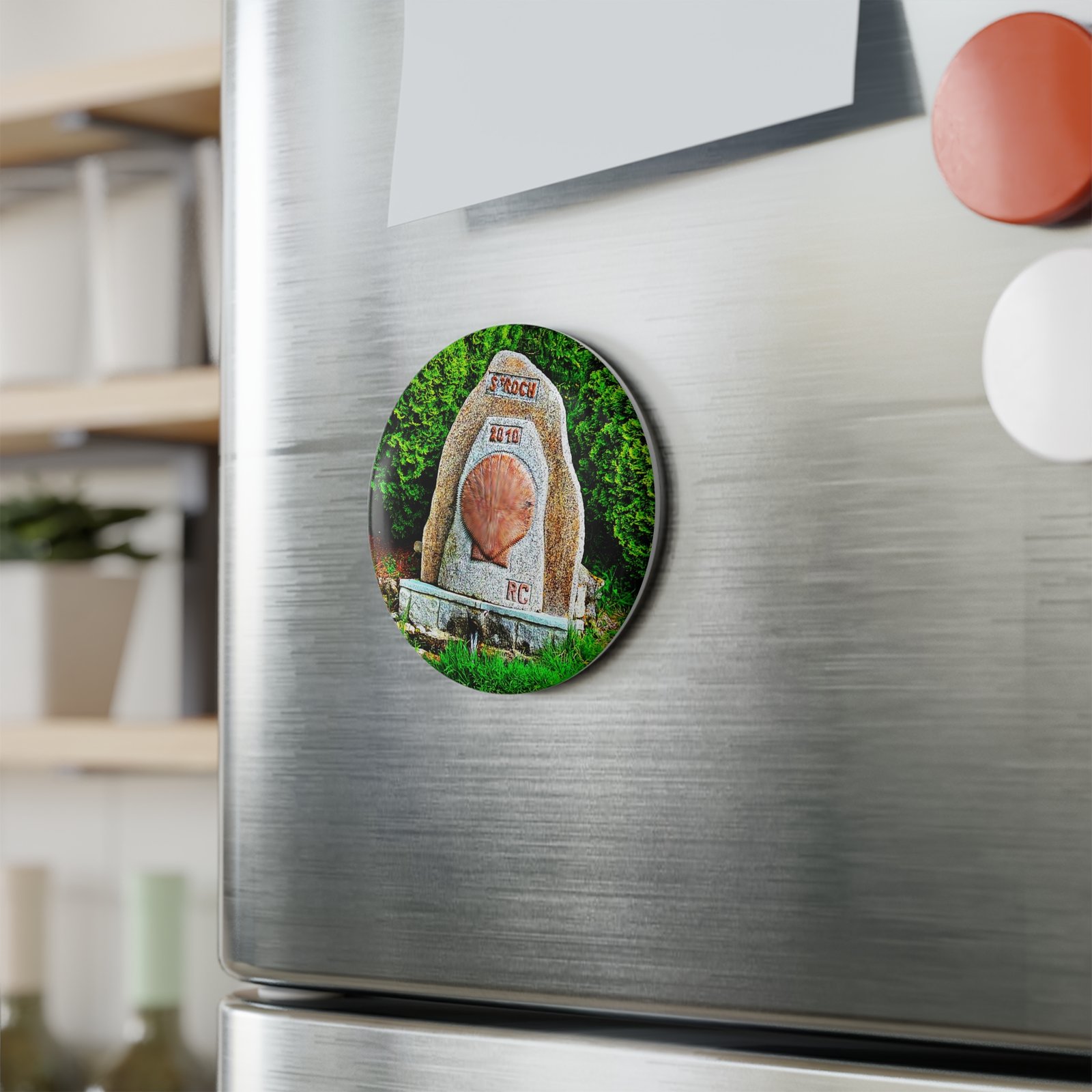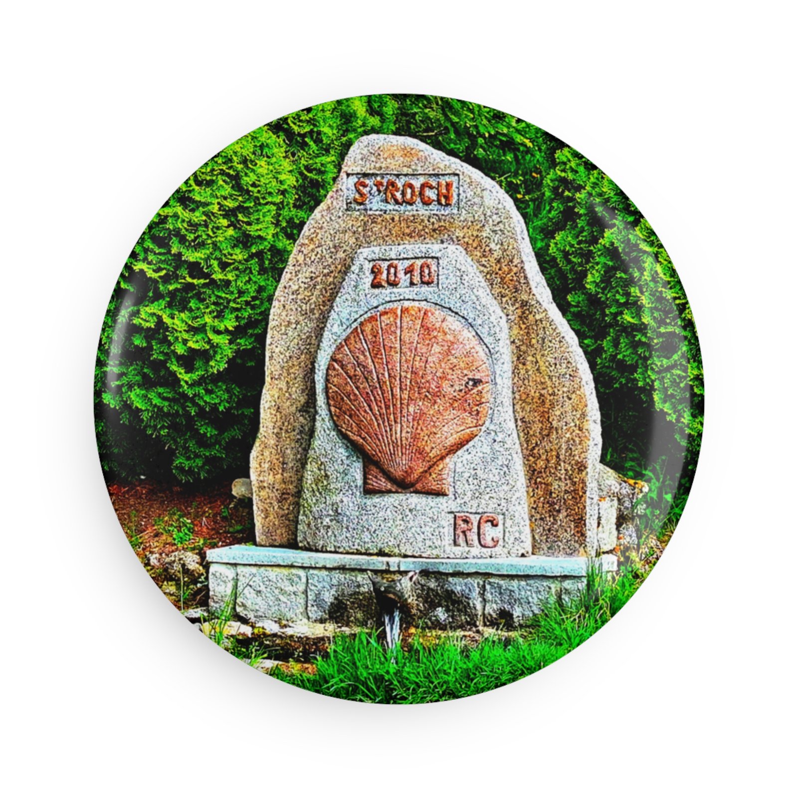 A small, beautifully detailed round magnet that brings a touch of coastal pilgrimage to any magnetic surface. The image features a carved stone marker with a scallop shell motif set against rich greenery — warm earth tones and crisp greens stay vivid thanks to premium inks and a protective mylar/UV coating. It feels like a quiet stop on a long walk: place it on your fridge, locker, or travel journal to recall the calm of that moment each time you pass by. Lightweight and durable, the metal shell with a flat magnetic back keeps it snug while the gloss finish brightens the design without hiding the stone texture and carved details.