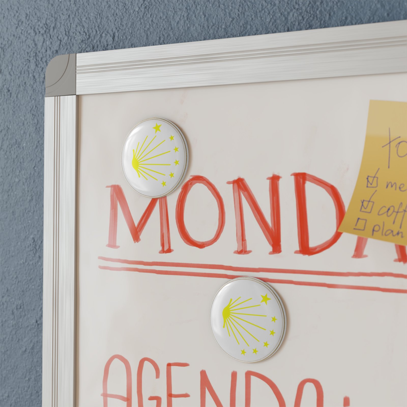 This bright, round button magnet brings a small flash of sunshine to any magnetic surface. Its simple yellow scallop-and-stars graphic reads cheerful and modern on a clean white background — a subtle emblem that adds personality to fridges, lockers, or metal boards. The metal shell and flat magnetic backing keep it snugly in place while the clear mylar/UV cover locks in the vibrant print and shields against scratches. Choose one to try it out, or grab a pack of ten to scatter across your space or share with friends. The compact 2.25″ size slips into everyday life easily: hold notes, keep lists visible, or use as a tiny decorative accent that brightens mornings and small moments.