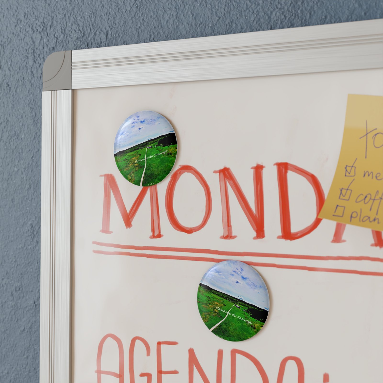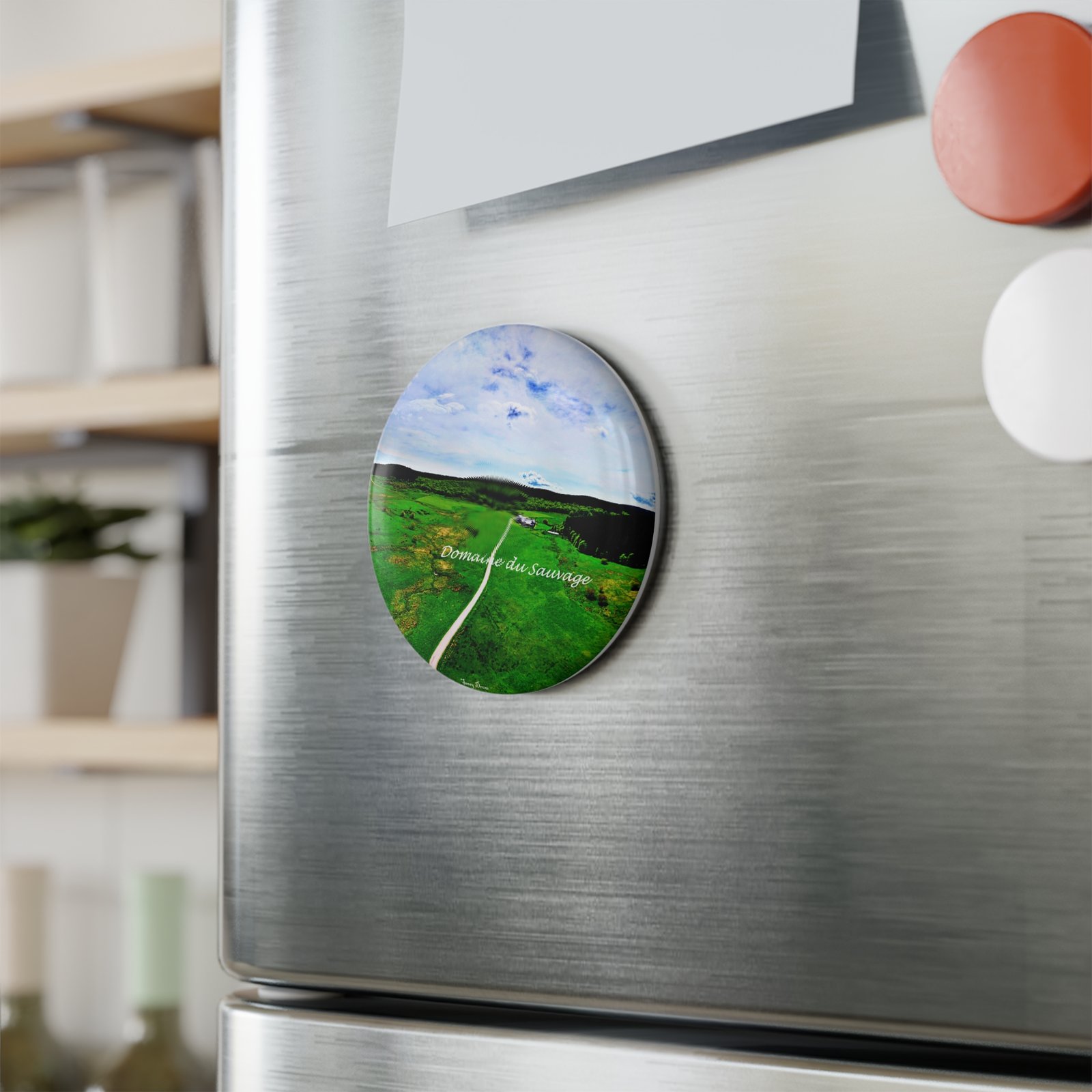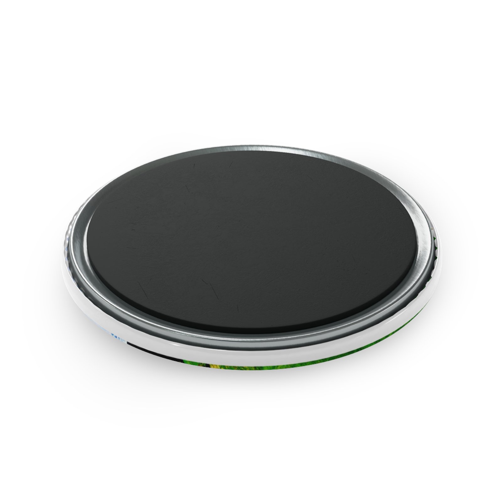 windows to wide-open country. This round button magnet carries a softened aerial photograph of rolling green fields and a narrow white lane leading to a distant farmhouse. It feels like a breath of fresh air on a cluttered fridge — a quiet reminder of open skies, slow drives, and a place where time thins out. Pop one on a metal board to keep notes, photos, or postcards company; place several together to create a small landscape you can touch. The glossy mylar finish catches light, deepening the greens and blues while protecting the image from daily wear. Comfortable in everyday life, this magnet brings a little patch of countryside into city kitchens, studio spaces, and camper vans alike.