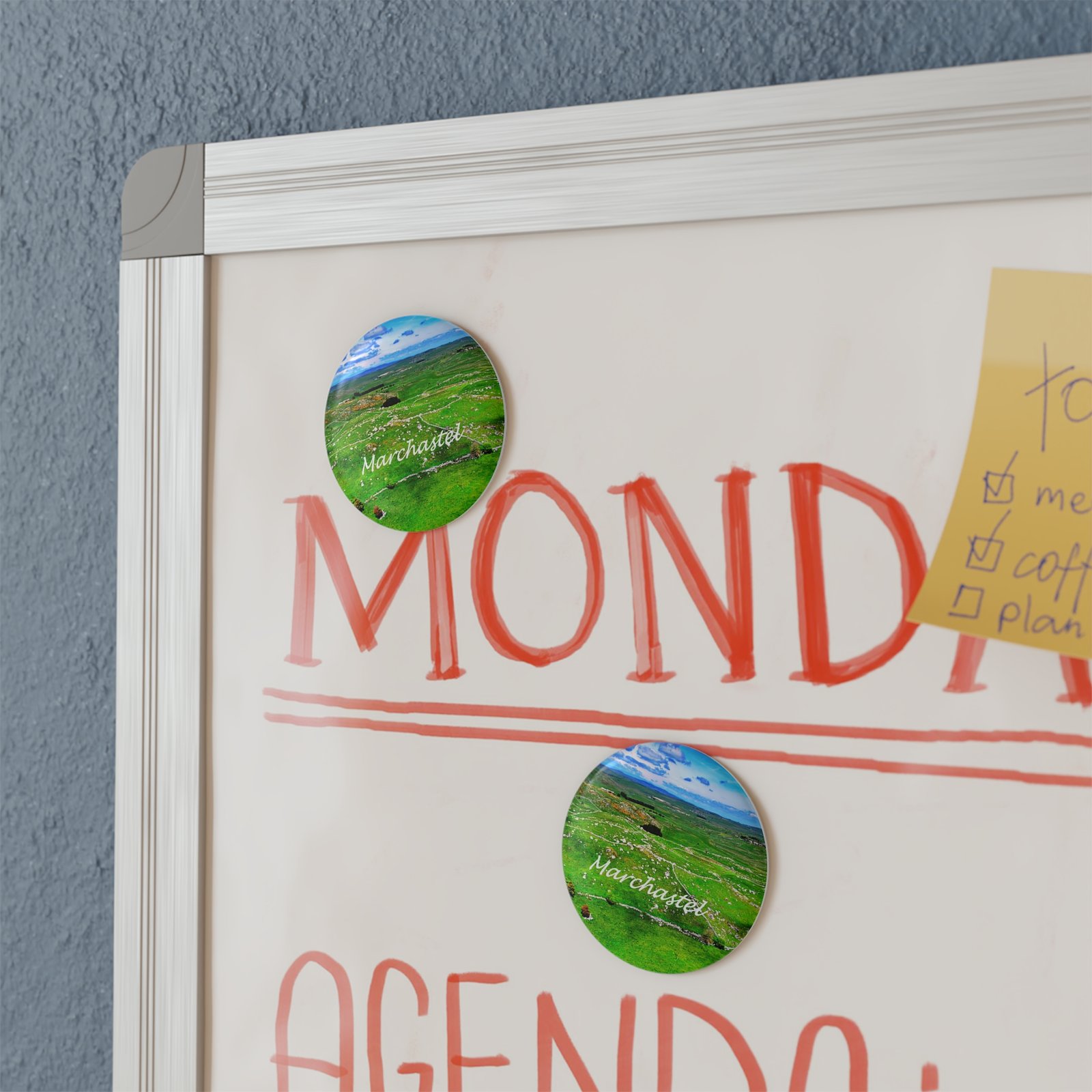 A small, cheerful magnet that brings a slice of open countryside to your kitchen, office board, or caravan door. Printed with vivid, fade-resistant inks and sealed beneath a clear mylar/UV cover, this 2.25″ round magnet holds its color and detail through everyday use. The slim metal shell and flat magnetic back sit flush on metal surfaces, keeping photos, notes, and maps in place while adding a bit of pastoral charm. Comes as a single magnet or in a set of ten—great for scattering a cohesive look across a fridge, filing cabinet, or travel tack board.