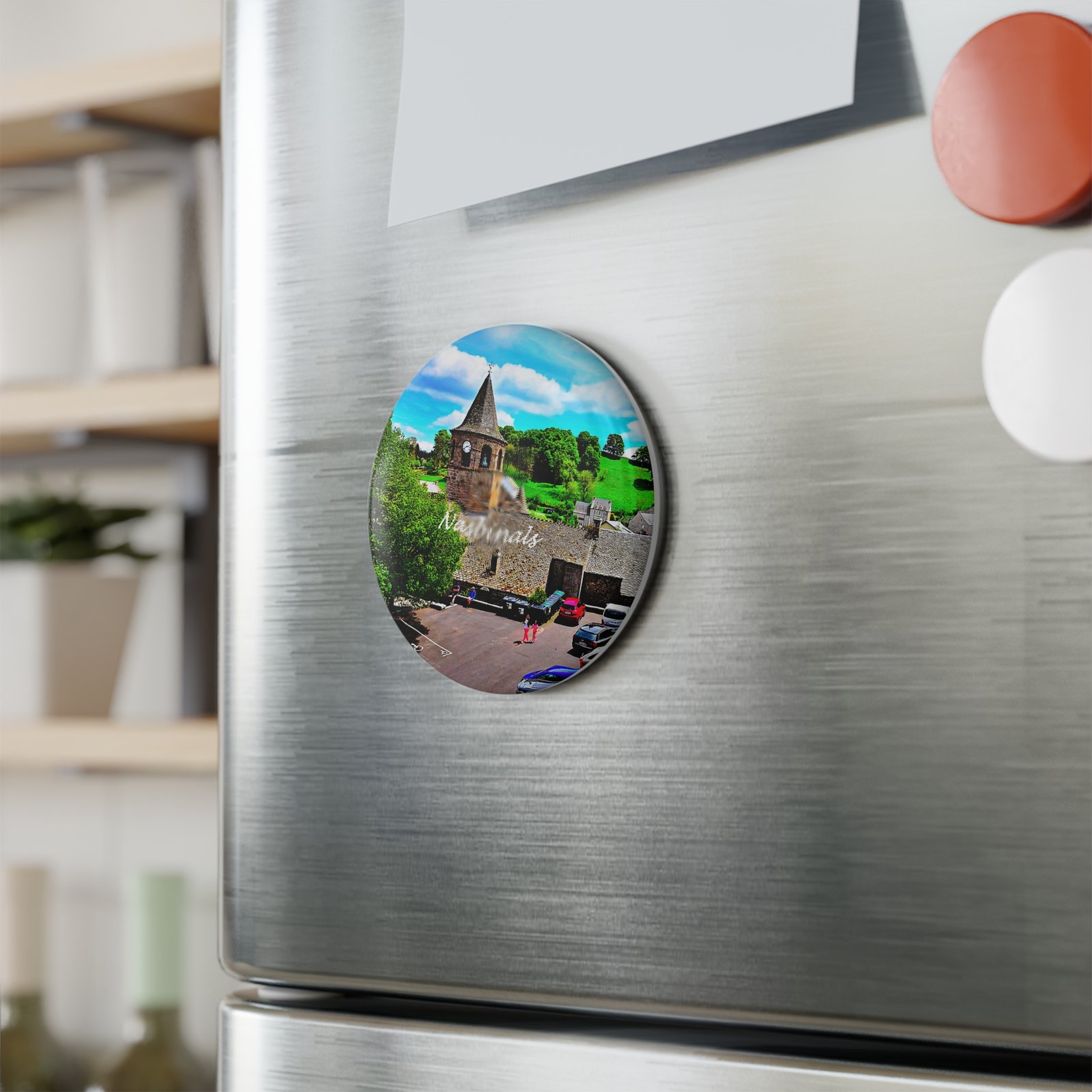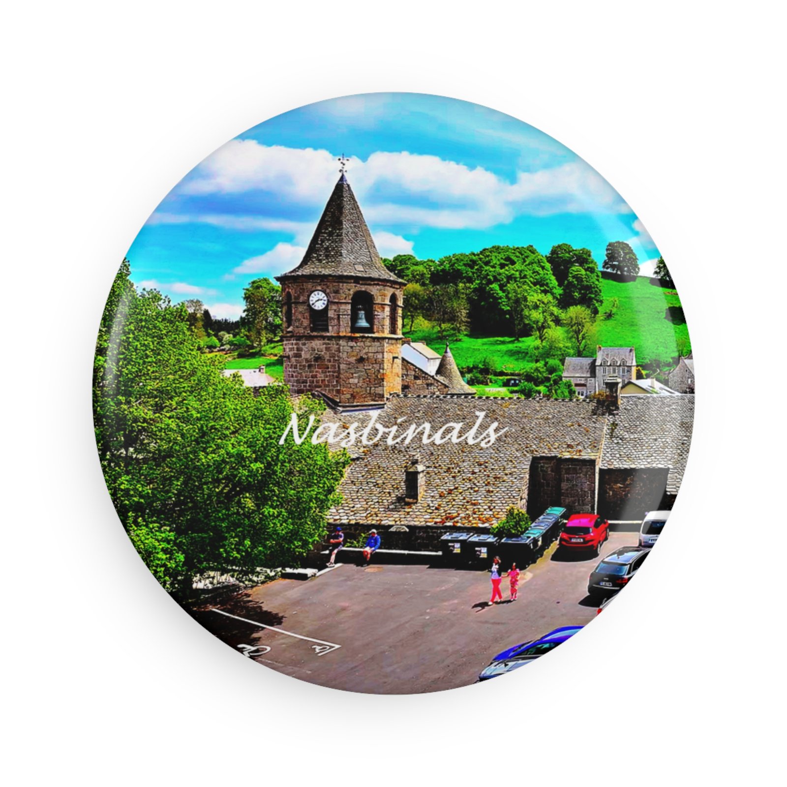 A small, cheerful keepsake that brings a pocket of place and memory into everyday life. This round magnet features a glossy mylar/UV-protected print of a sunlit village scene — stone church tower, green hills, and tiny figures moving through a warm square. Stick it to the fridge, a locker, or a bulletin board to hold notes and photos while quietly reminding you of slow afternoons, cobbled streets, and bright skies. Durable metal shell and flat magnetic backing keep it firmly in place, while the vivid inks keep the colors lively for years.