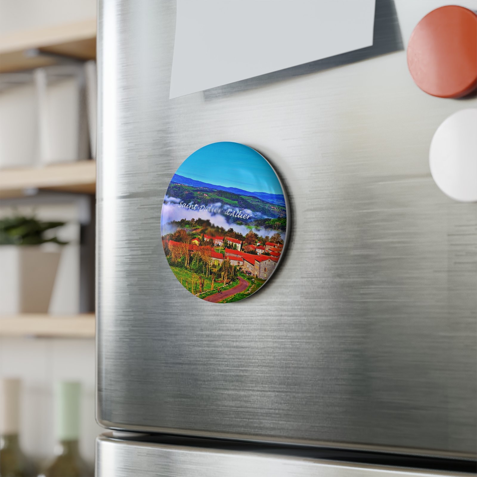 Bright, round souvenir magnet featuring a vivid landscape print of Saint-Didier-d’Allier. The glossy mylar finish enhances the saturated blues and greens while protecting the image from scratches and UV fading. Slim metal shell with a strong flat magnetic backing makes it easy to display on refrigerators, lockers, or any magnetic surface. Comes singly or in a bundle of ten so you can keep one and share the rest with friends and family who love collecting travel mementos.