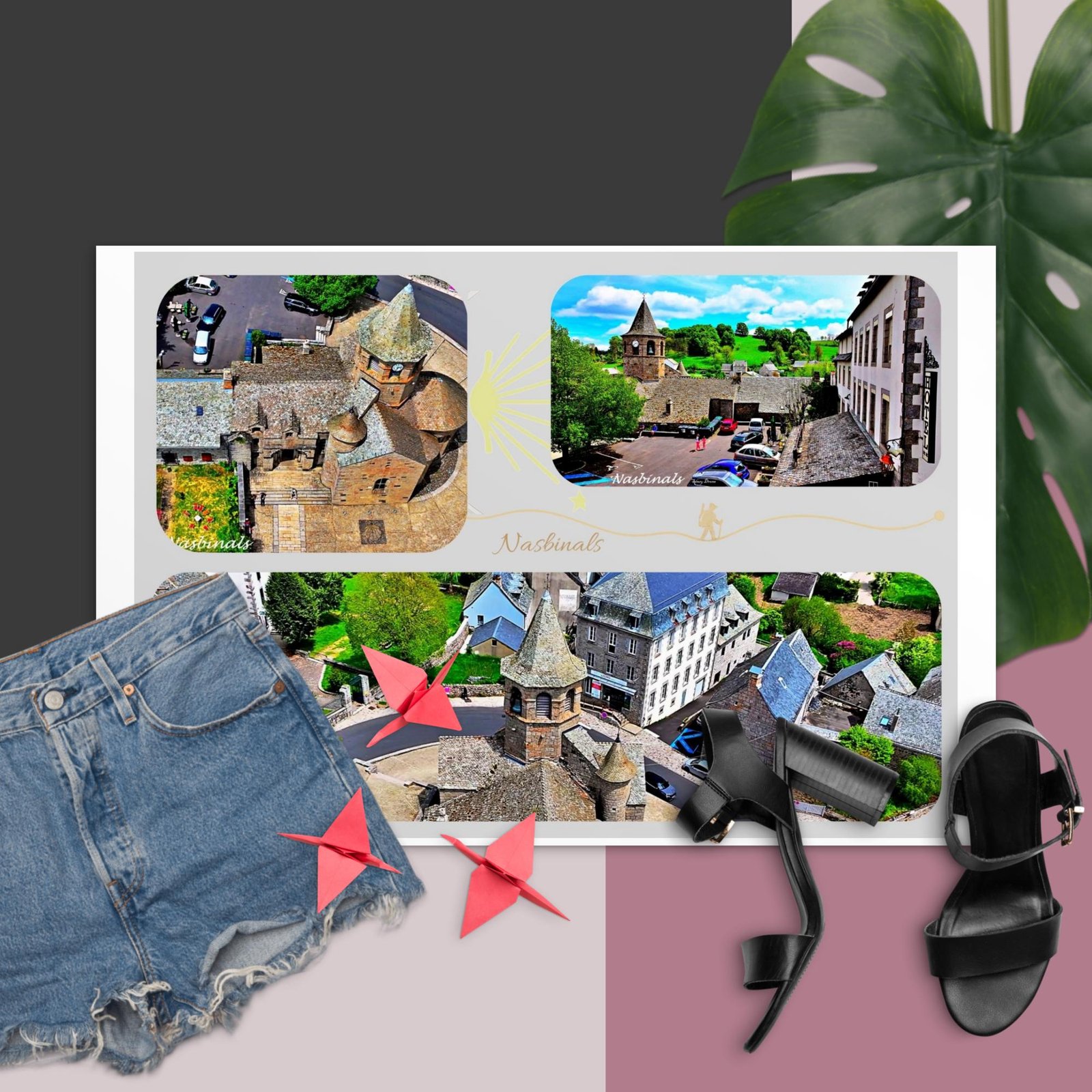Cette composition photographique aérienne révèle les toits de lauzes, l’église romane Notre-Dame-de-l’Assomption et les ruelles qui accueillent, depuis des siècles, pèlerins et voyageurs.
