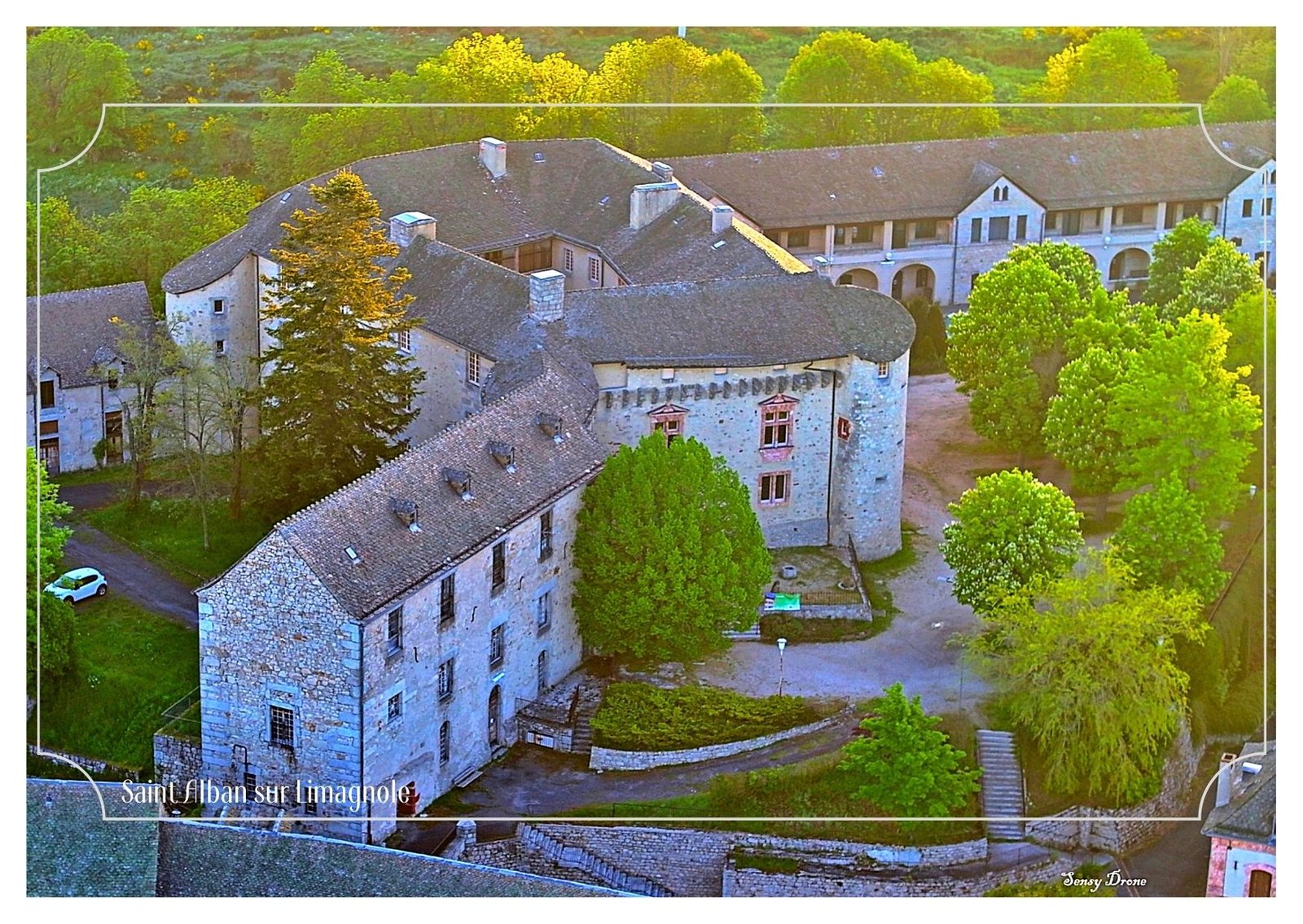 Édifié au cœur de la Margeride, le château de Saint-Alban-sur-Limagnole se déploie ici dans son ensemble, puissant et apaisé.