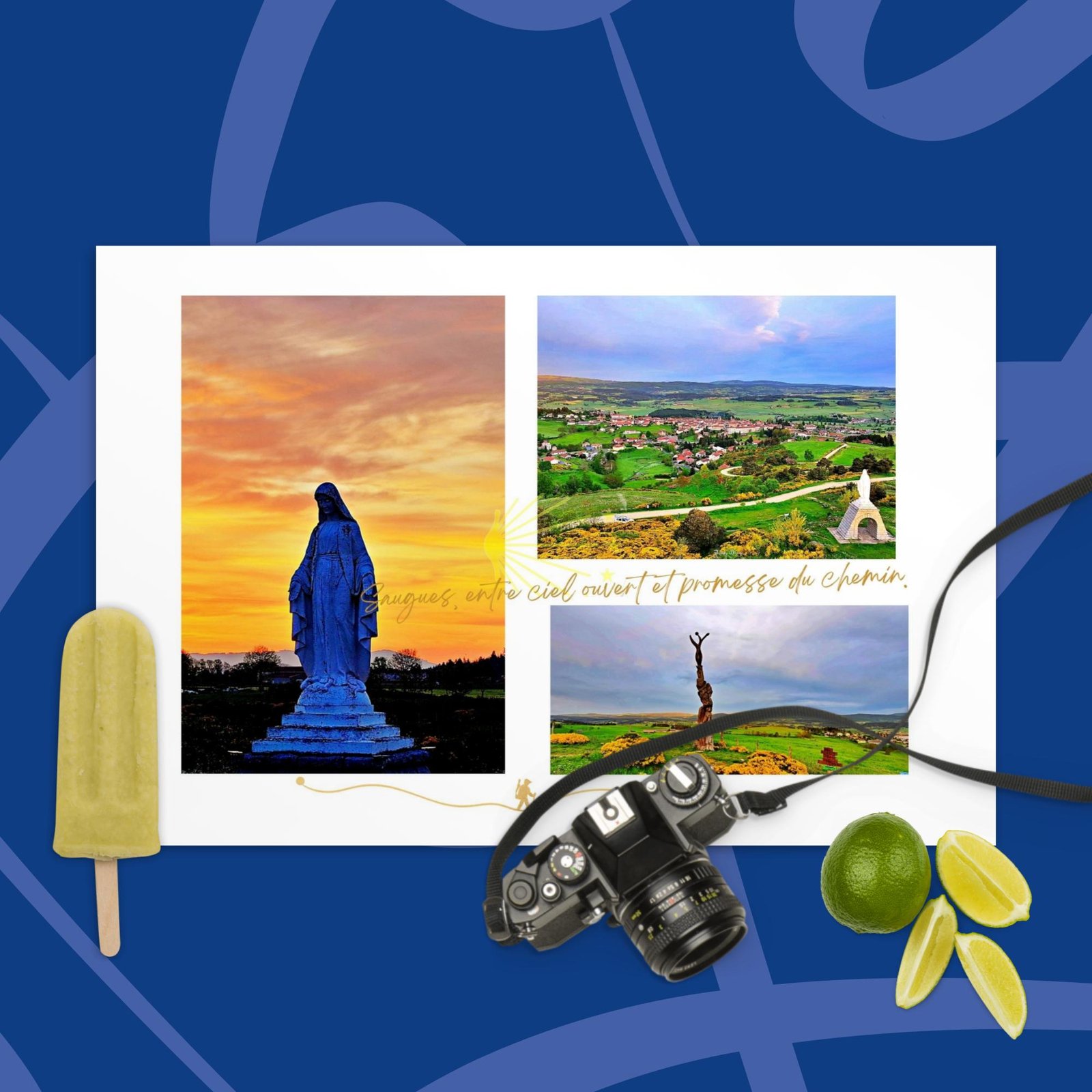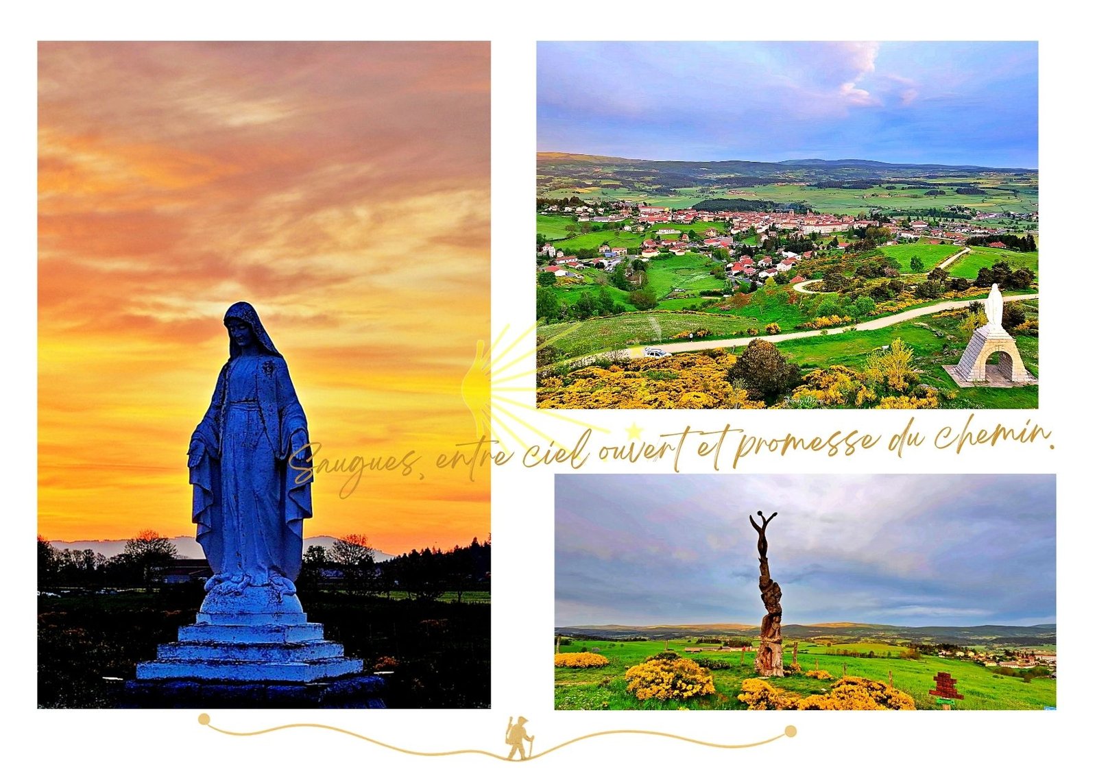 Posée sur les hauteurs de la Margeride, Saugues marque un seuil sur le Chemin de Compostelle.Ici, le paysage respire large : collines ondoyantes, horizons dégagés, lumière changeante.Les statues veillent, immobiles mais présentes, comme des repères silencieux pour celles et ceux qui avancent.