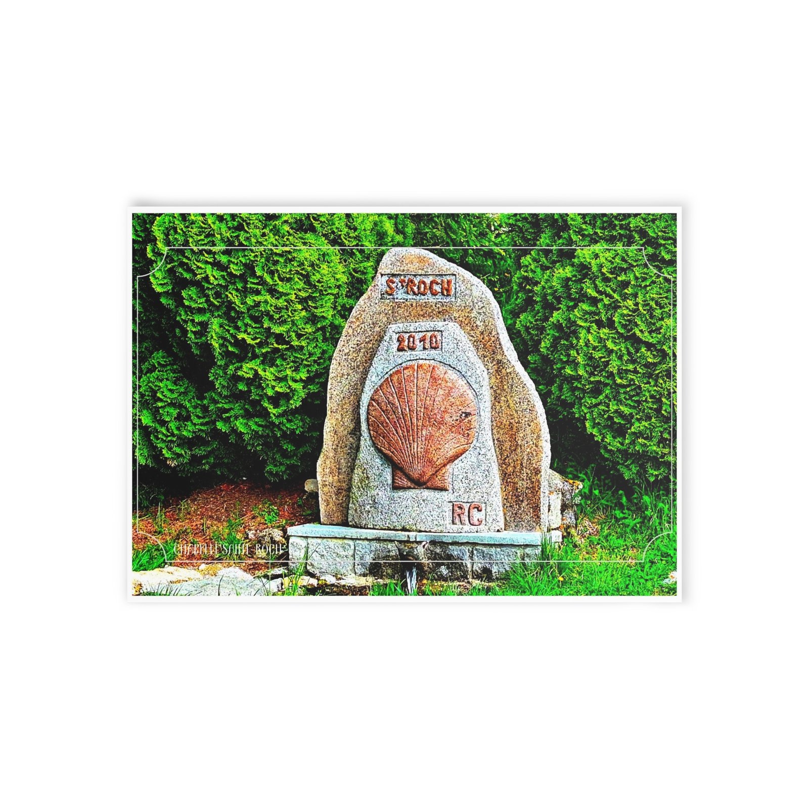 Sur le Chemin de Saint-Jacques-de-Compostelle, certaines pierres parlent plus fort que les mots. Devant la Chapelle Saint-Roch, cette pierre sculptée porte la coquille du pèlerin, symbole universel de la marche, du passage et de l’espérance.