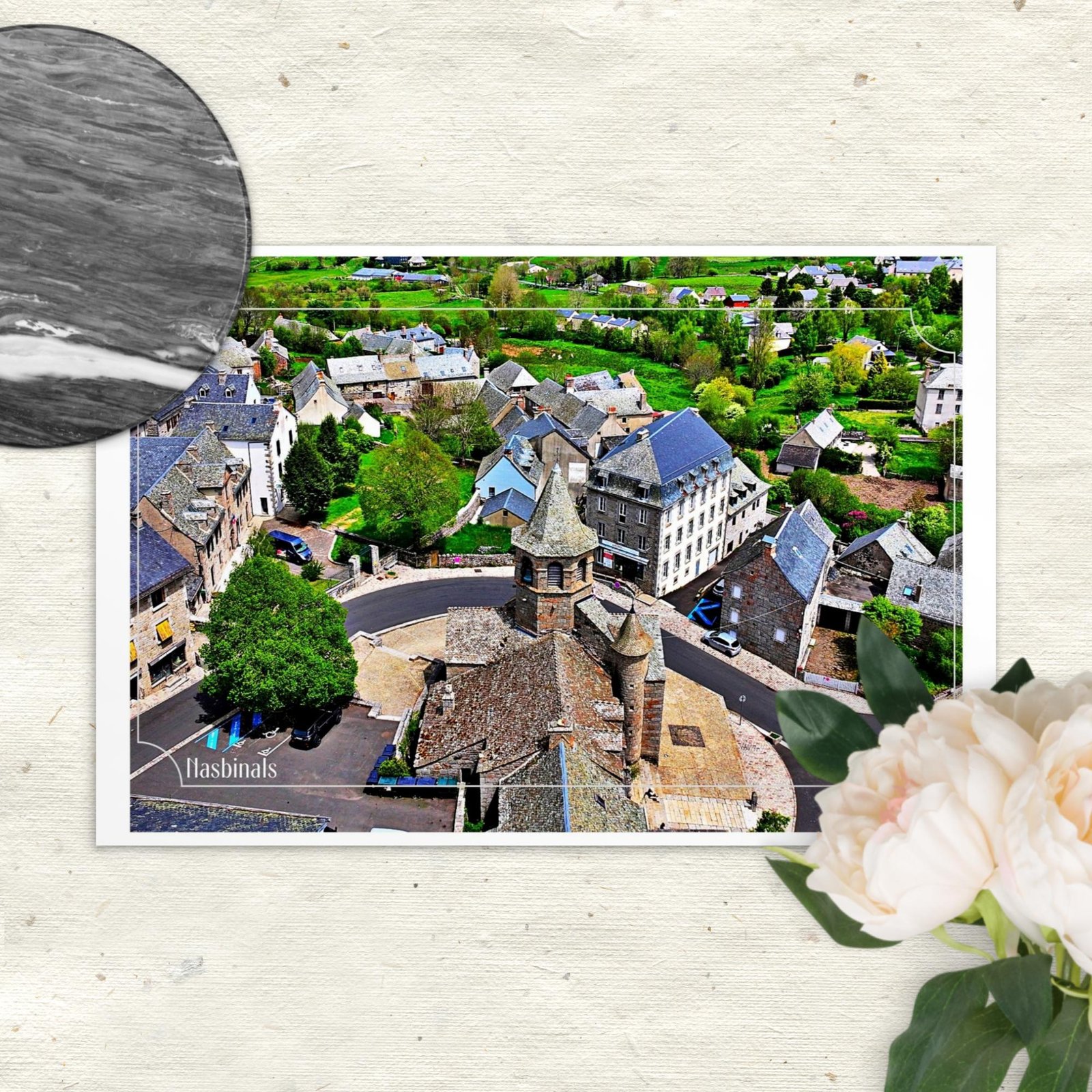 Vue d’en haut, elle révèle la force tranquille de son architecture, la douceur des toits de lauze, la rondeur du parvis et l’harmonie patiente du bourg qui l’entoure.