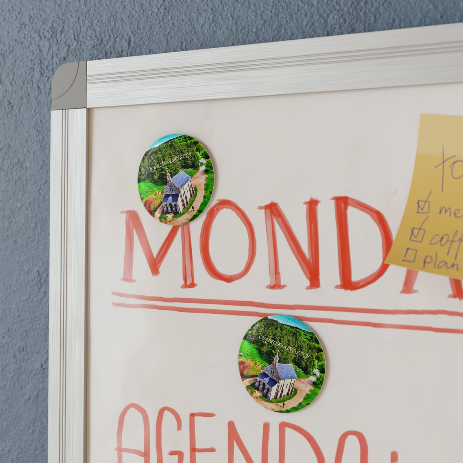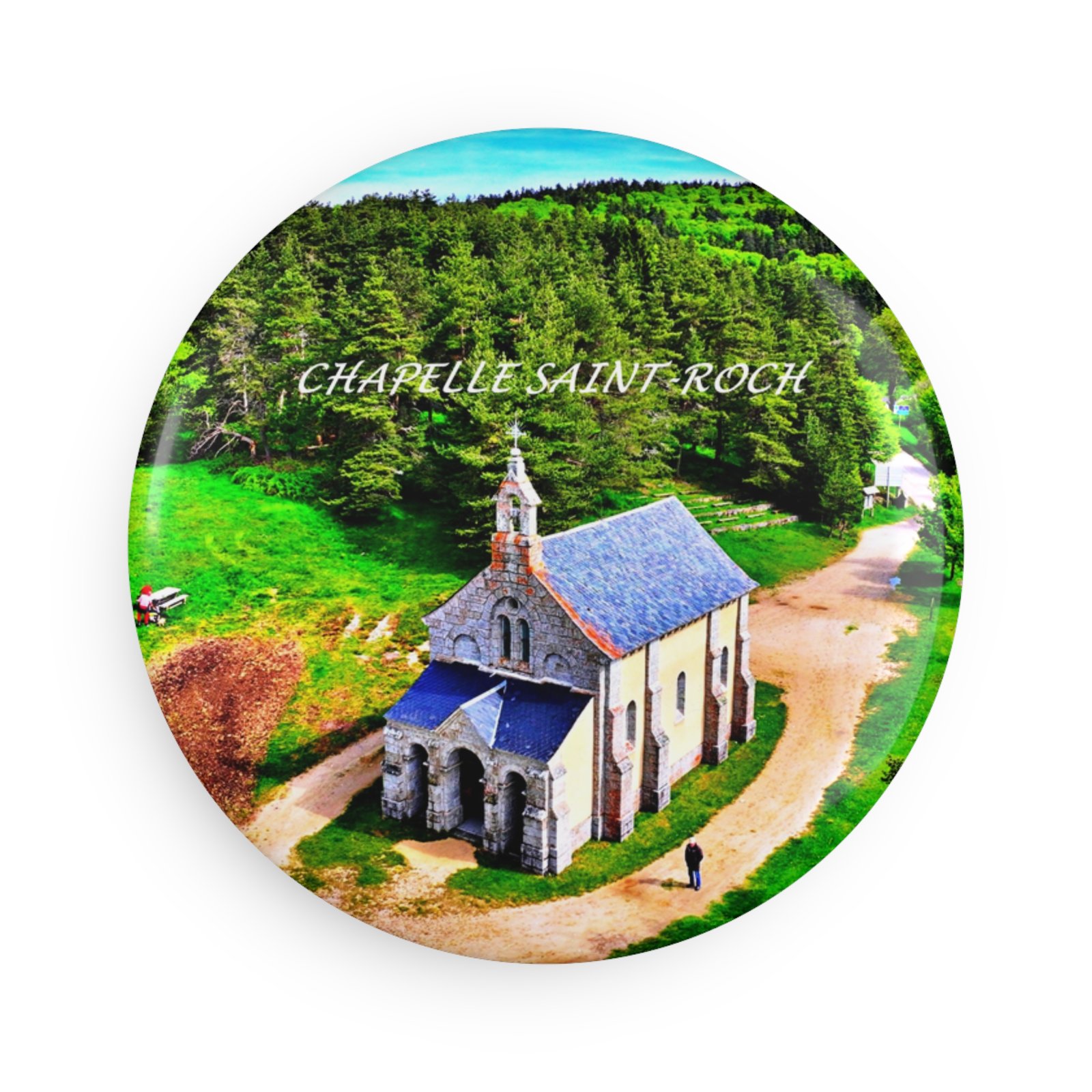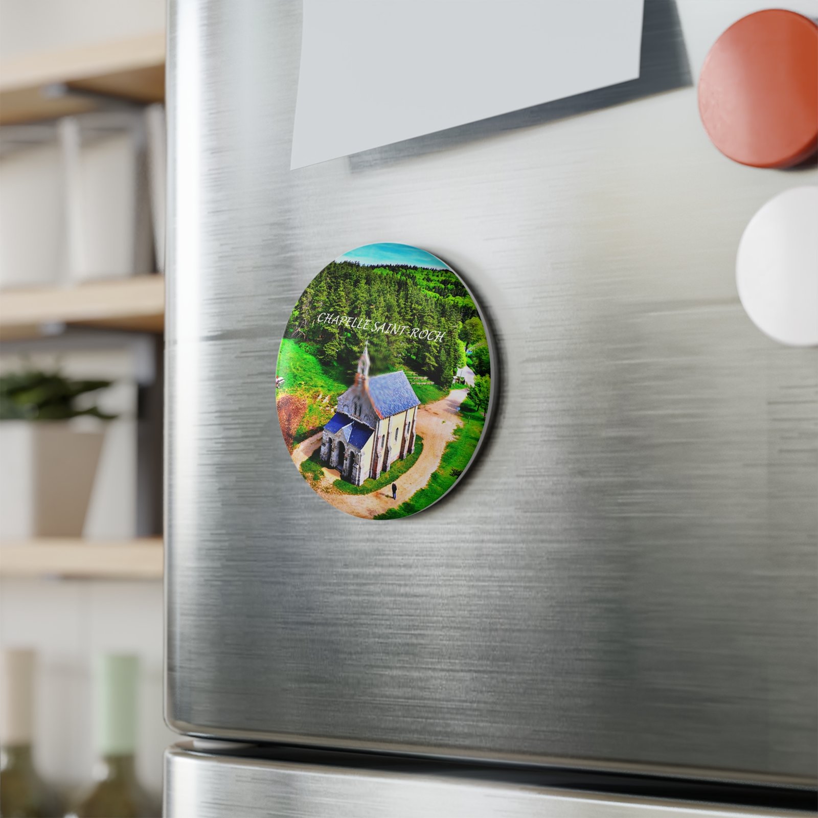 A small, artful magnet that brings a sunlit hilltop chapel and a pocket of forest straight to your fridge. The round 2.25″ metal magnet features a high-resolution print sealed under a glossy mylar/UV cover, keeping the vivid greens and slate roof crisp over time. It’s lightweight and slim, with a flat magnetic backing that holds notes, photos, or travel mementos without bulk. Whether clustered with other keepsakes or standing alone, it adds a quiet, nostalgic moment to a kitchen, office board, or locker.