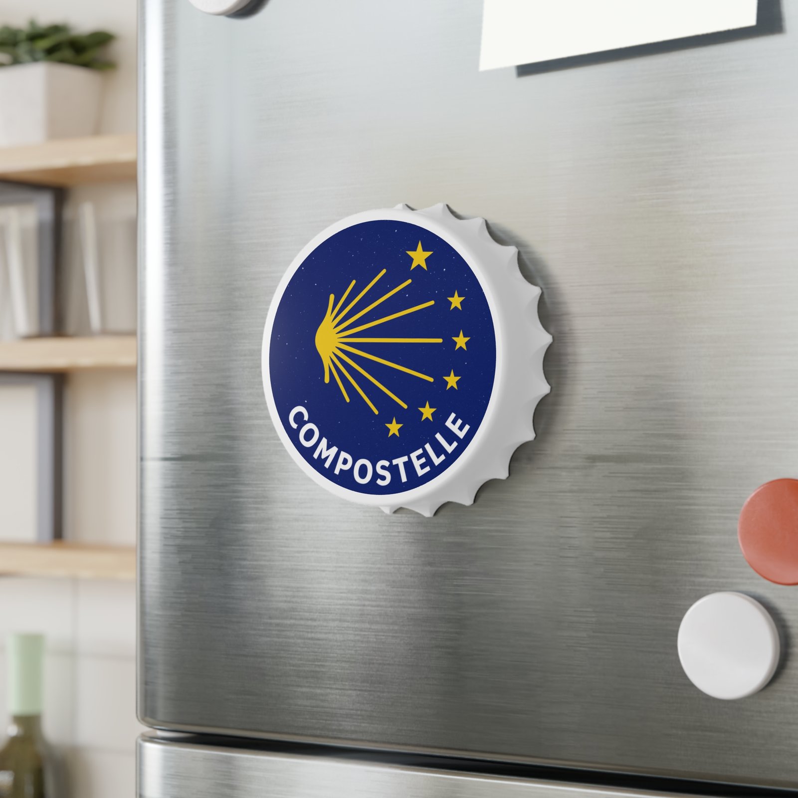 Glisse un peu de Compostelle dans ton quotidien avec ce décapsuleur aimanté, inspiré de la coquille dorée et des étoiles qui guident les pèlerins depuis des siècles.