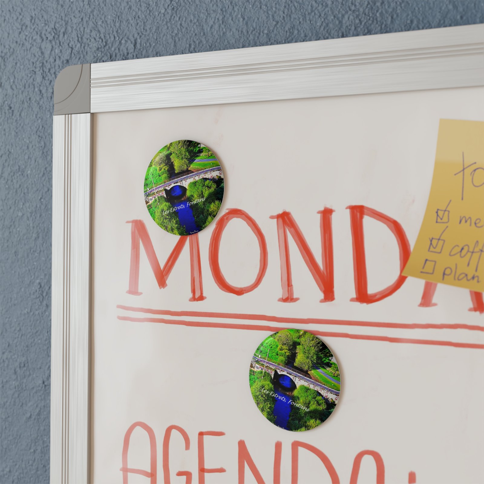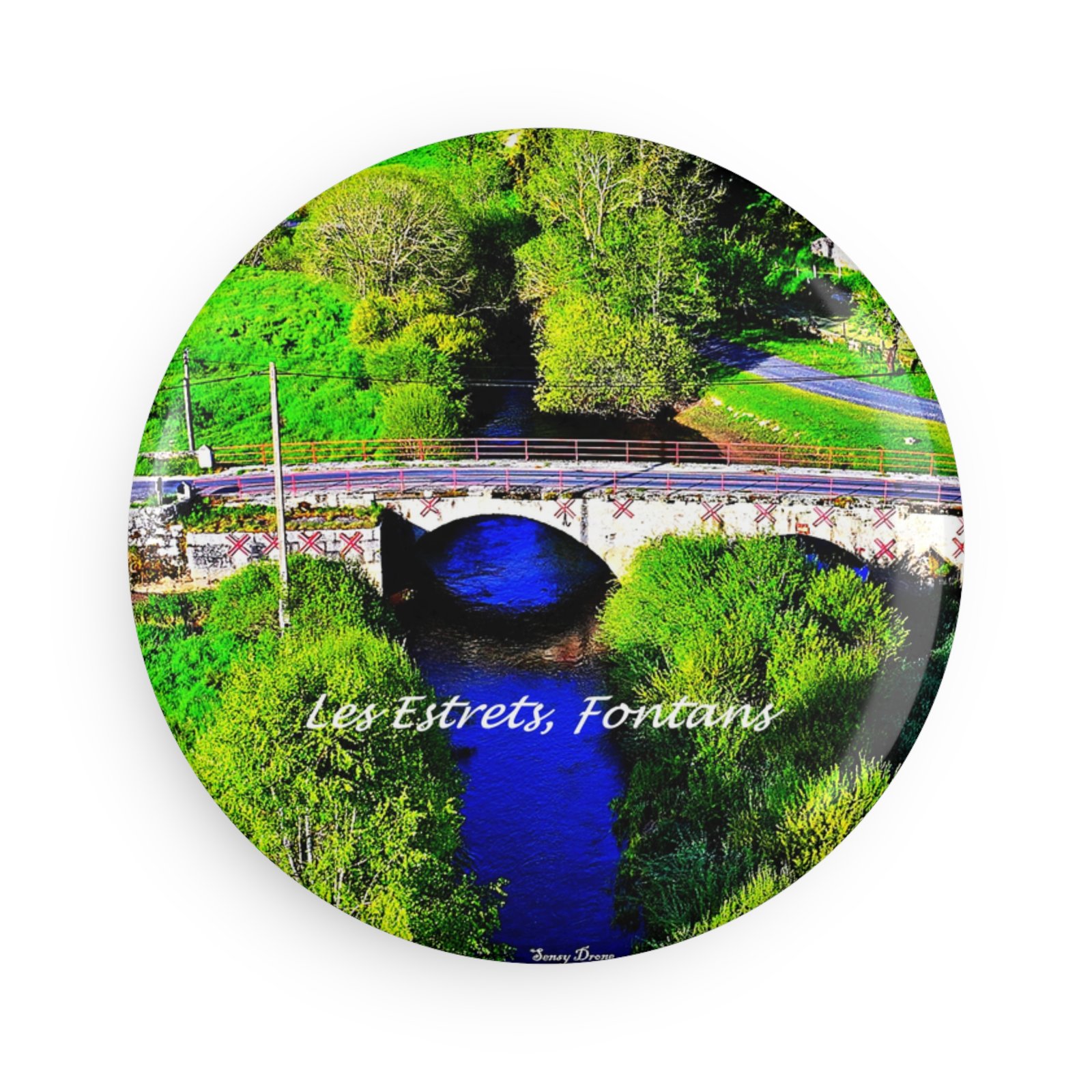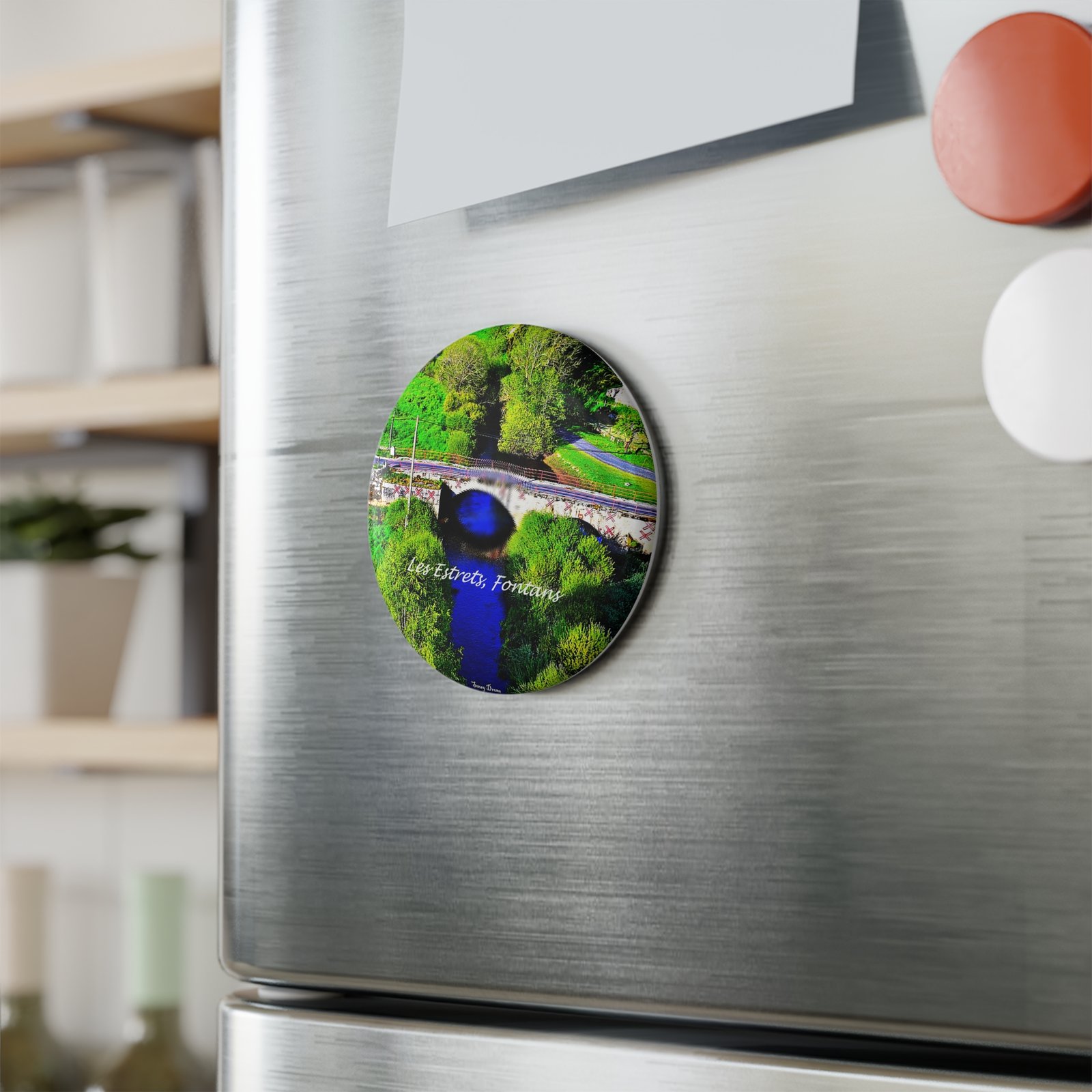 A small, vibrant round magnet that brings a slice of riverside charm to any magnetic surface. The glossy mylar finish deepens the blues and greens of the scene, while the durable metal shell and flat magnetic backing keep it snug on fridges, lockers, and metal boards. Light and unobtrusive at 2.25″ (5.7 cm), it works as a keepsake from a favorite place or a colorful accent to everyday spaces — a quiet reminder of winding paths, stone bridges, and the calm of water running through town.