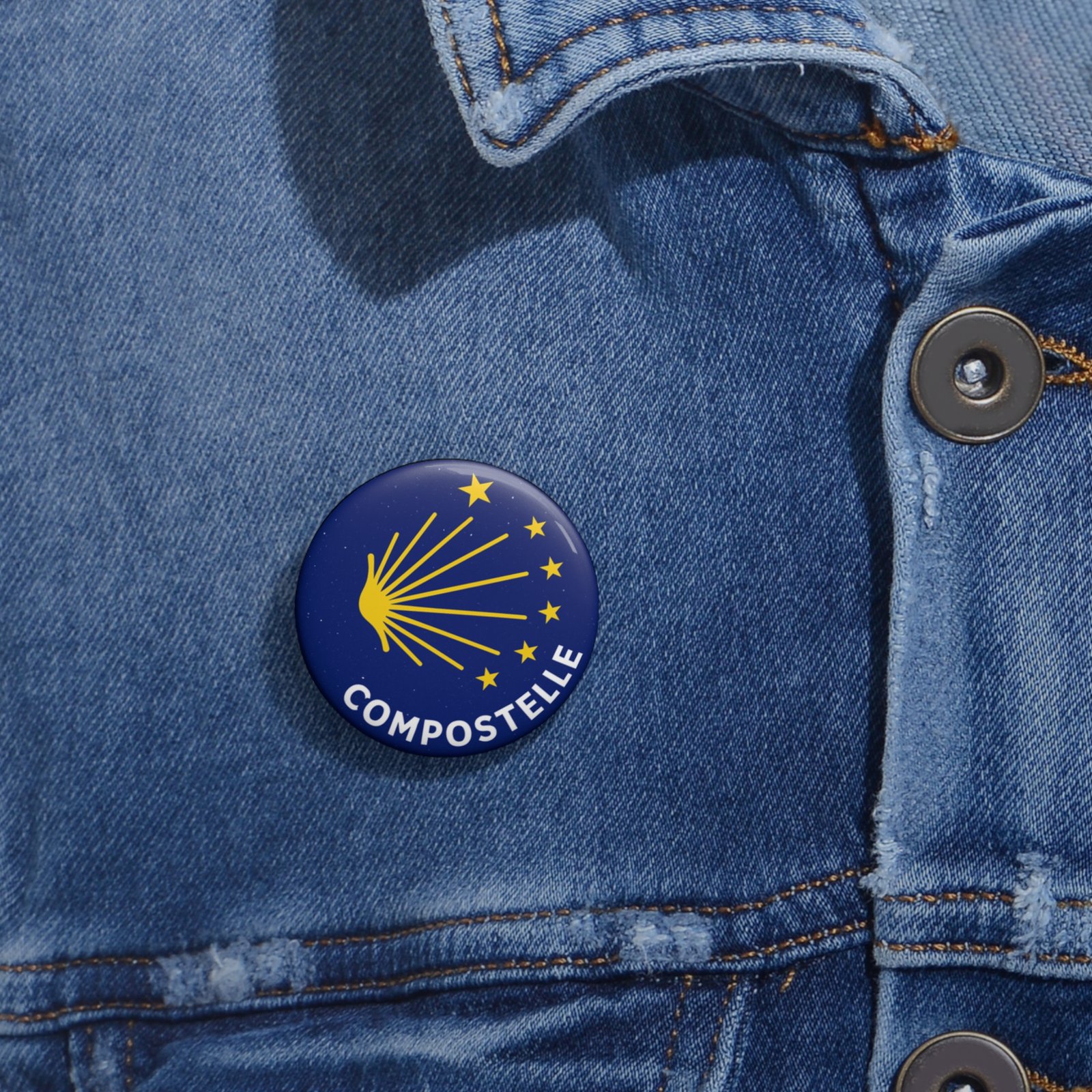 Ce pin rond “Coquillage jaune Camino” est une petite étoile à accrocher partout où ton cœur voyage.