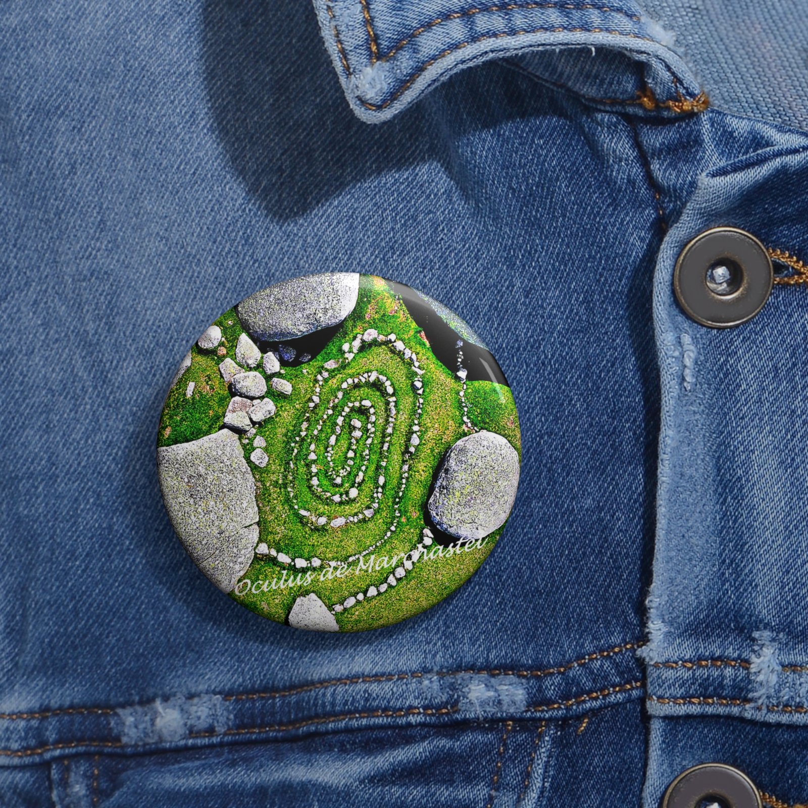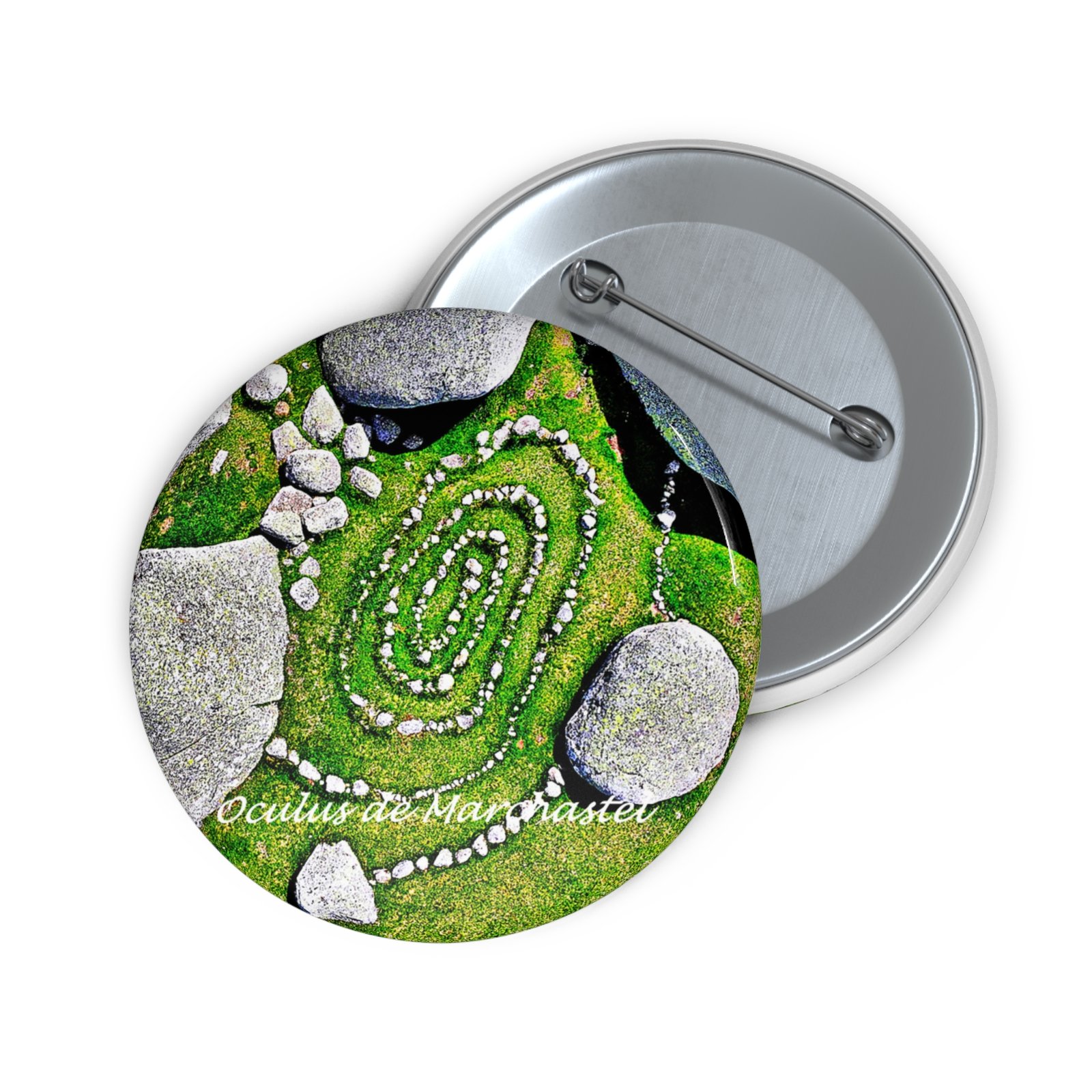 Small, bright pin buttons that carry a touch of wandering calm. Each metal button features a glossy mylar face with crisp, vibrant color — here showing a miniature stone labyrinth set in lush green moss. They clip onto denim jackets, canvas bags, or linen hats and act as little reminders to slow down and notice the path beneath your feet. The steel safety-pin backing holds the button securely while being easy to remove and move between outfits. Assembled in the USA from globally sourced parts, these pins are built to keep their shine: scratch- and UV-resistant, with a smooth glossy finish that highlights every pebble and blade of moss in the design.