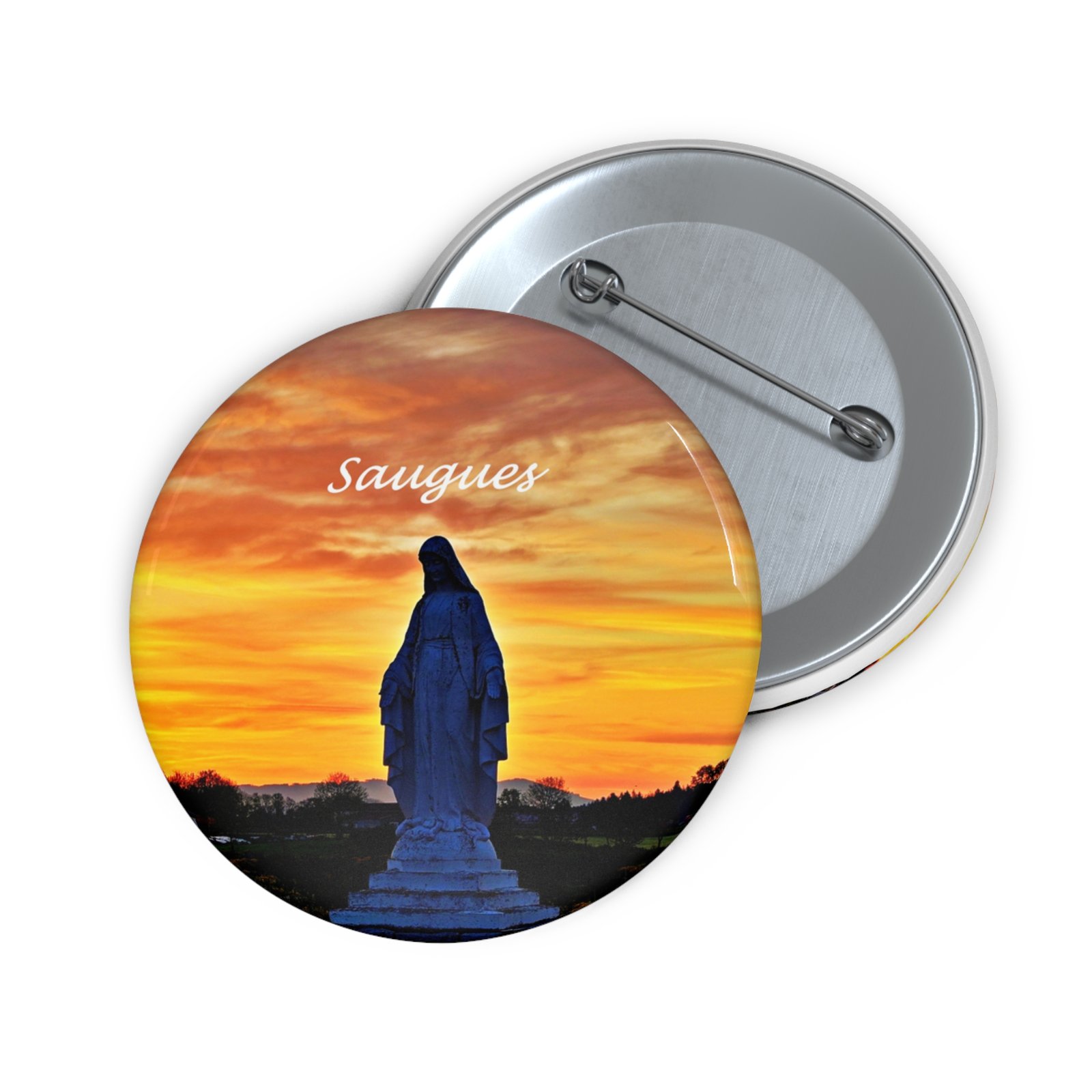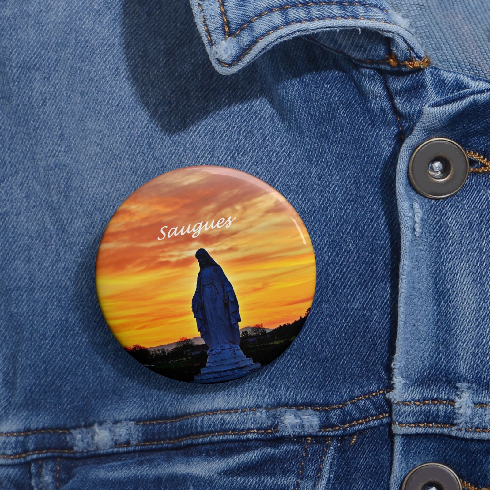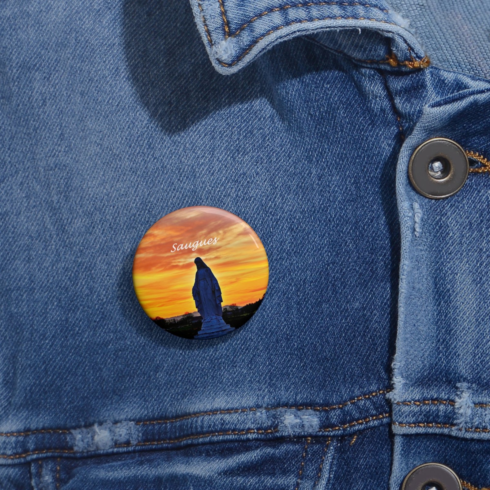 A small, glossy pin button that carries a moment — a silhouetted statue against a blazing sunset. It tucks easily onto jackets, backpacks, or lapels and holds vibrant color and detail thanks to a mylar-protected finish. Lightweight and sturdy, it brings a quiet, reflective accent to everyday gear and gatherings, whether worn alone or in a cluster of meaningful pins. Handmade assembly in the USA adds a thoughtful touch to an accessory that invites conversation and memory.