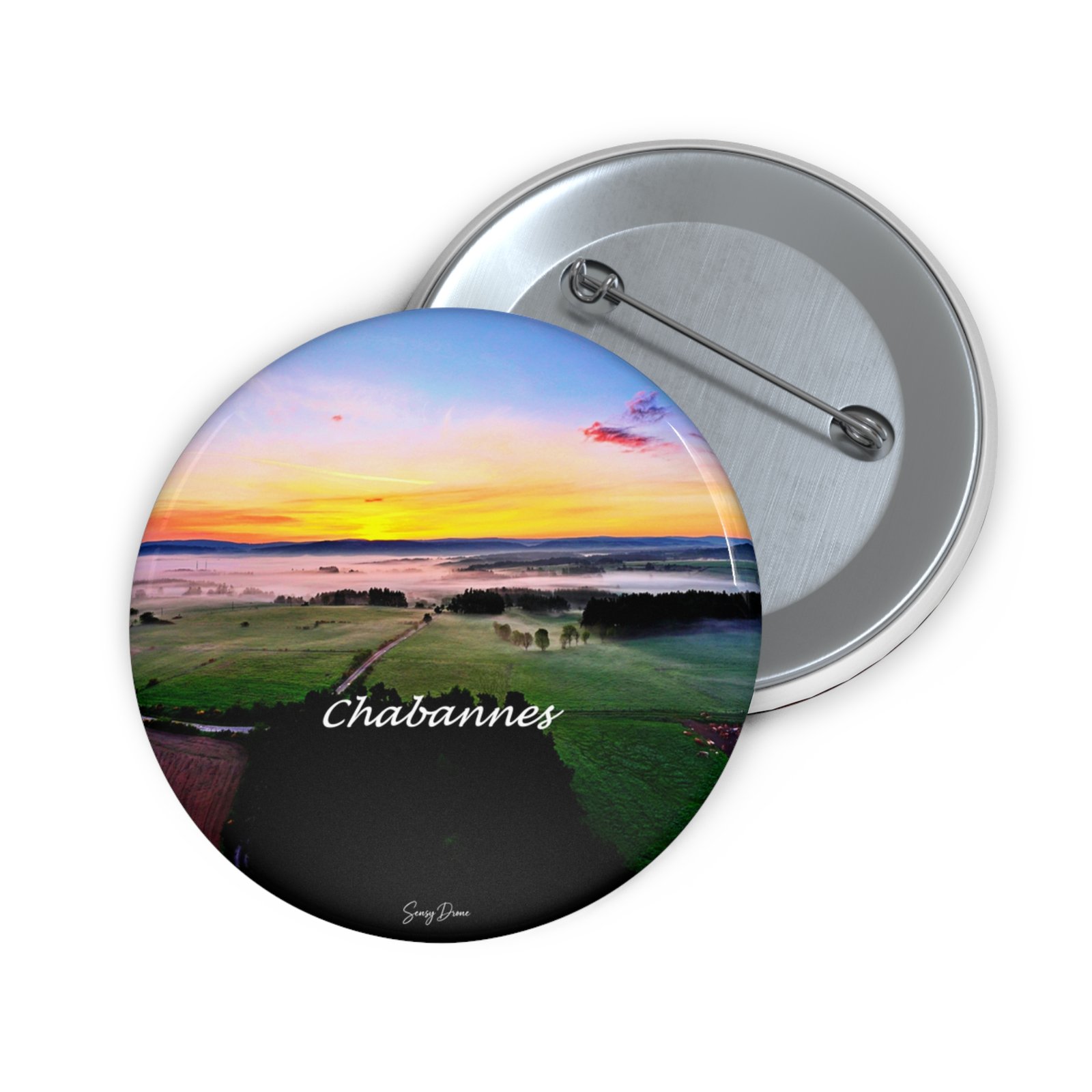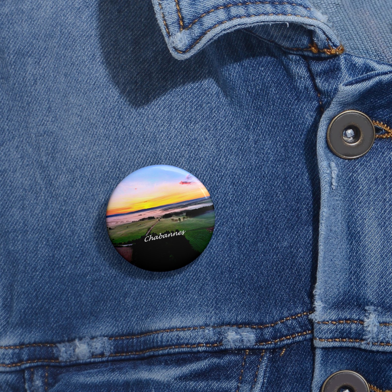 A small, glossy metal pin that captures a peaceful sunset landscape in vivid color. The rounded button features a high-gloss mylar face that resists scratches and UV fading, keeping the bright hues rich over time. It fastens with a sturdy steel safety-pin backing so it sits securely on jackets, bags, or hats. Lightweight and available in three sizes, this pin adds a personal, travel-inspired accent to everyday wear and carries a quiet, nostalgic feel — like carrying a postcard-sized memory with you.