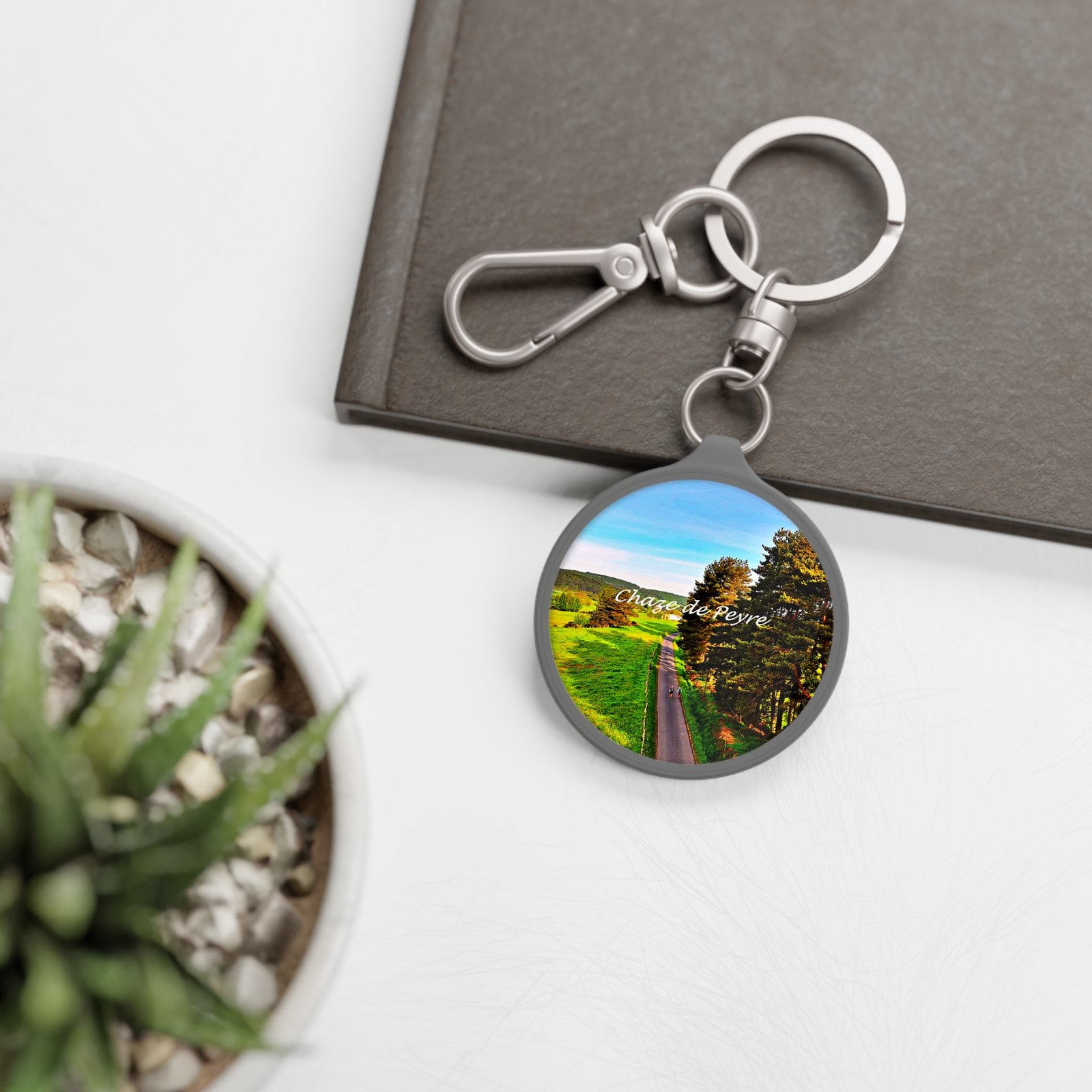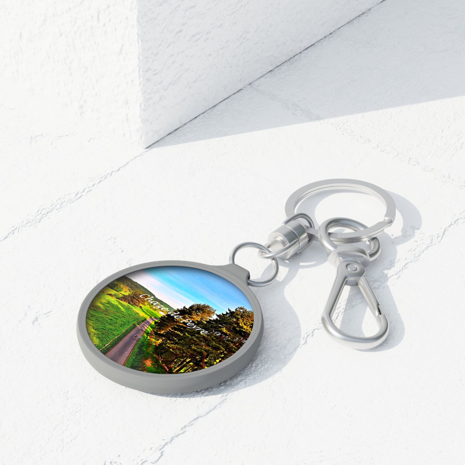 A small round keyring that carries a pocket-sized scene of open road and rolling green fields. The acrylic face is protected by a soft matte TPU cover, keeping colors bright while adding a subtle, velvety finish. Slip it on your keys, clip it to a bag, or let it hang from a zipper pull — it’s a wearable snapshot that brings a touch of countryside calm to everyday carry. The solid hardware and included ring and clasp make it easy to switch between backpacks, purses, and key loops. Durable yet gentle in feel, it’s made to be handled daily while preserving that sunlit image for the long haul.