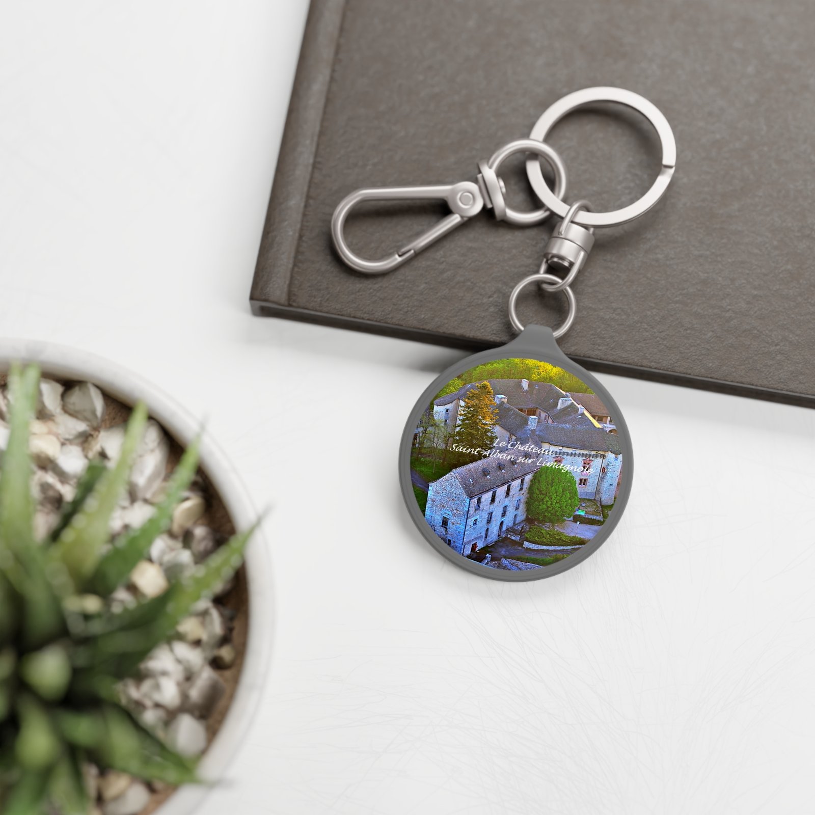 Porte-clés illustré d’une photographie aérienne de Saint-Alban-sur-Limagnole, village de Margeride situé sur le Chemin de Saint-Jacques-de-Compostelle, entre pierres anciennes et paysages apaisés.