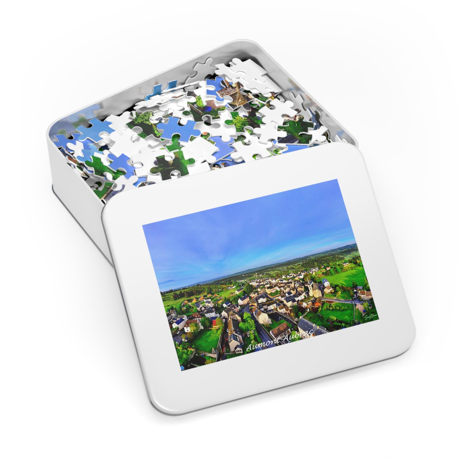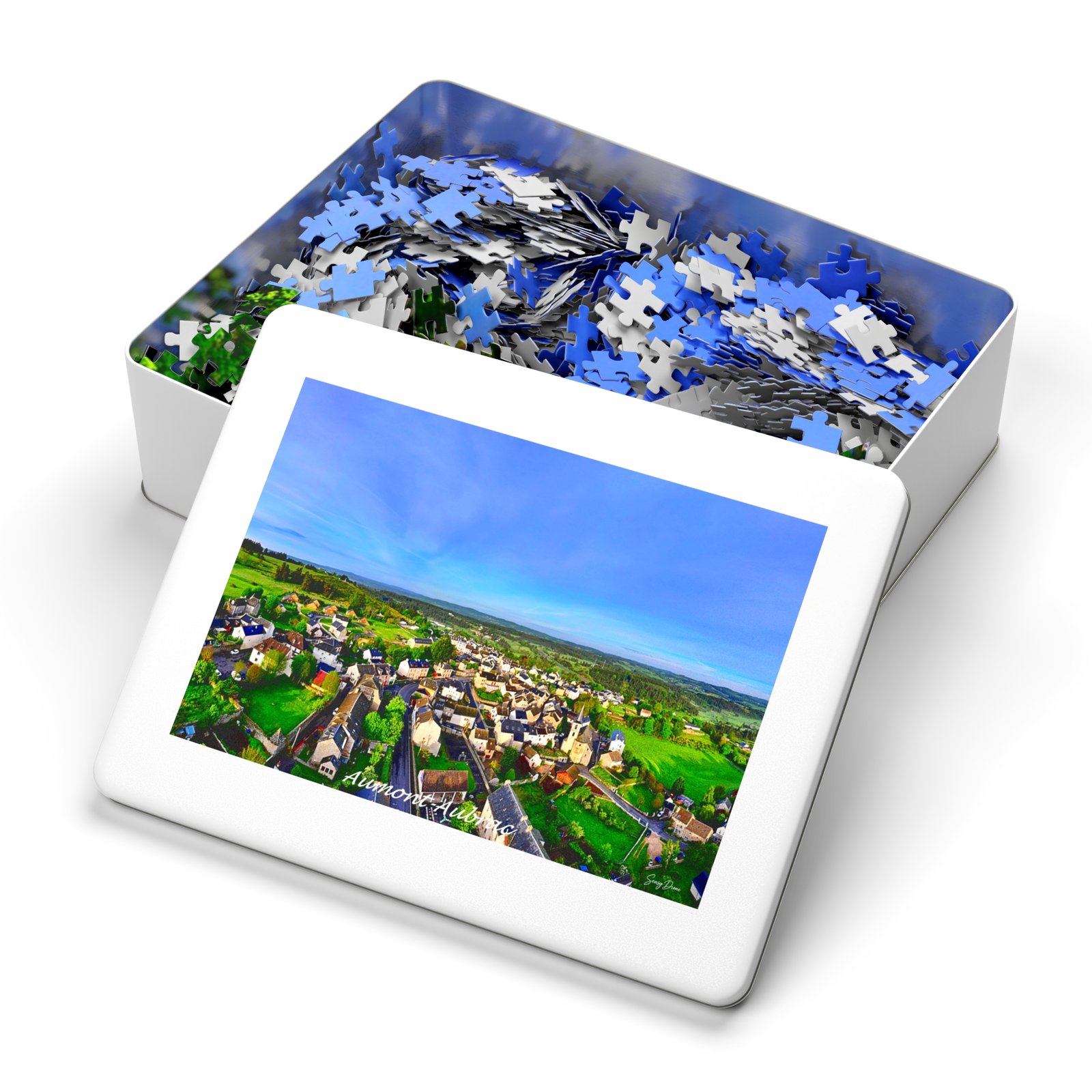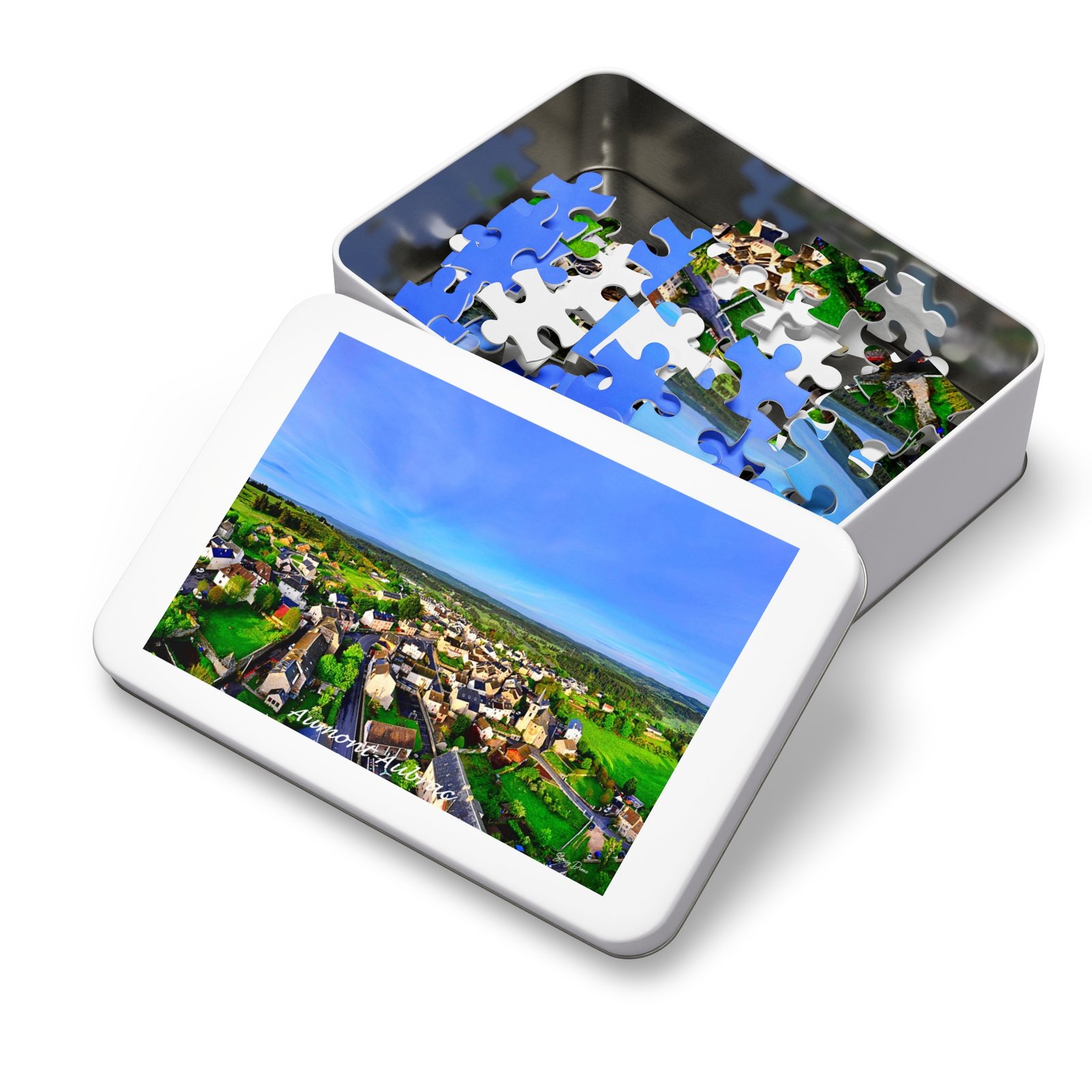 Spread out on a table, this glossy puzzle draws you into a peaceful aerial view of a village at golden hour. Each interlocking piece snaps together with satisfying precision as fields, rooftops and a wide blue sky emerge. The white metal tin keeps the pieces safe and the finished image on its lid lets you preview the scene or carry it along for weekend puzzling. Choose a quick 30-piece evening activity or challenge yourself with up to 2000 pieces — the same vibrant print and glossy finish scale beautifully for whichever session you crave. This puzzle turns a quiet hour into a restorative ritual: focus, calm, and the quiet joy of completing a detailed landscape.