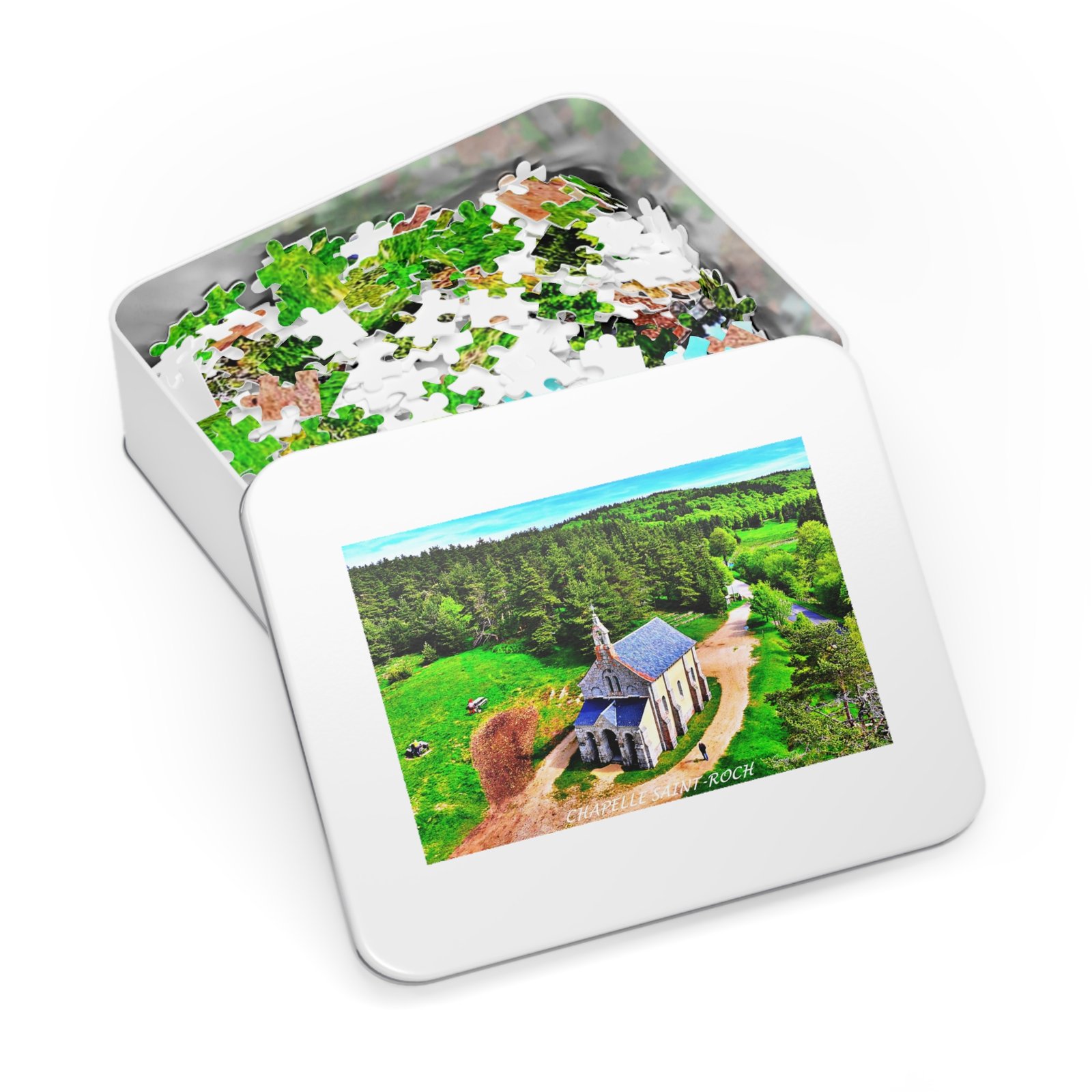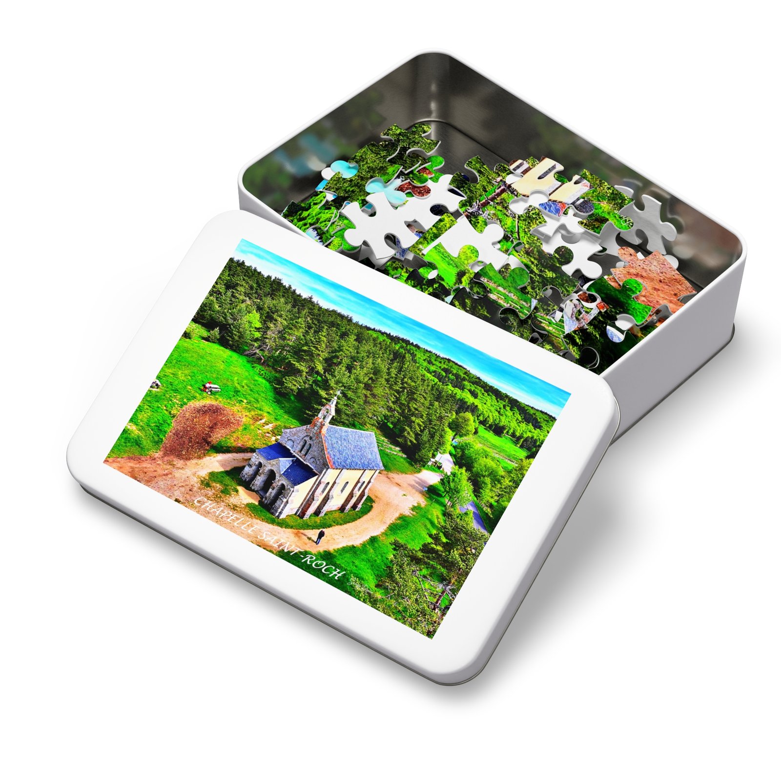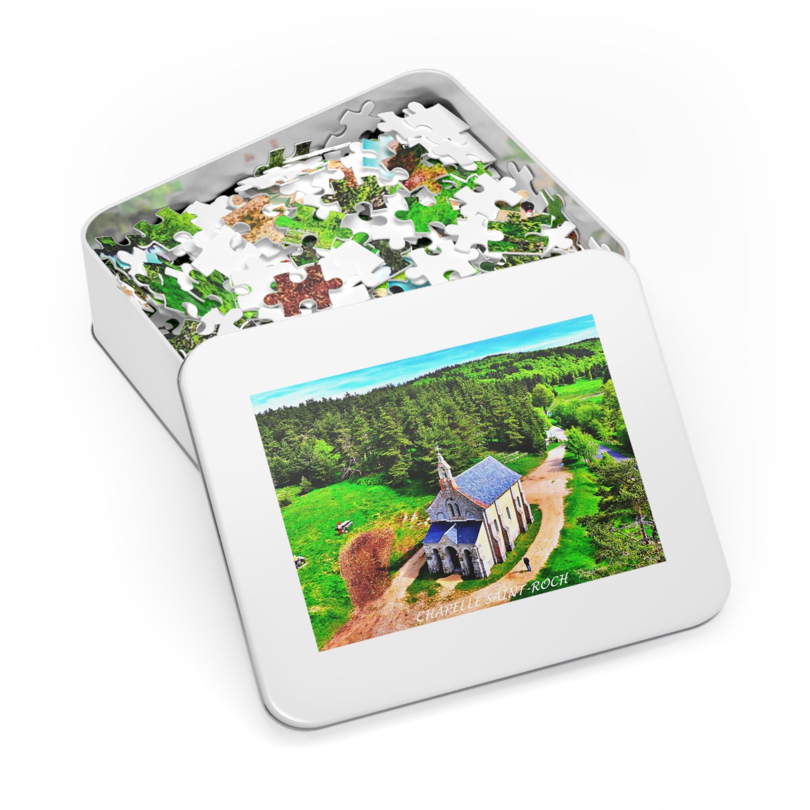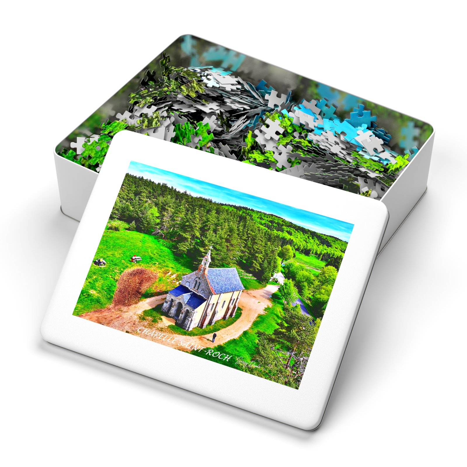 Turn an afternoon into a quiet escape with this high-quality jigsaw puzzle housed in a white metal tin. The image—a sunlit chapel tucked into rolling green hills and a ring of pines—invites slow, focused assembly and gentle wonder. Each puzzle variation uses crisp, vivid printing and a glossy finish that makes colors pop and details sing as you connect the pieces. The finished artwork also graces the tin cover and the full-bleed box to guide you while you work and to delight when shared or displayed. Whether you choose a quick 30-piece or a challenging 2000-piece set, the pre-die-cut chipboard and precisely interlocking pieces give a satisfying fit and an elegant display when complete.