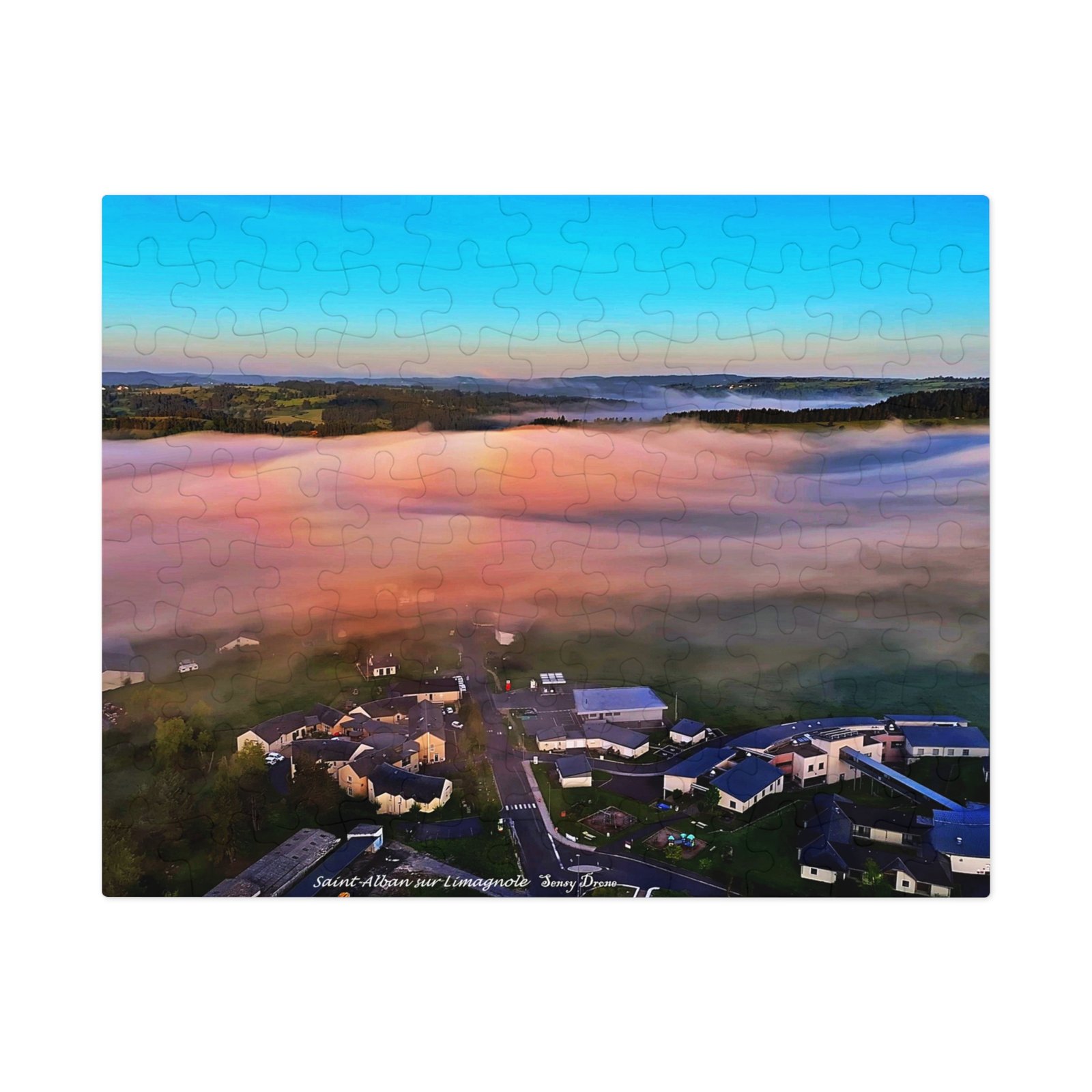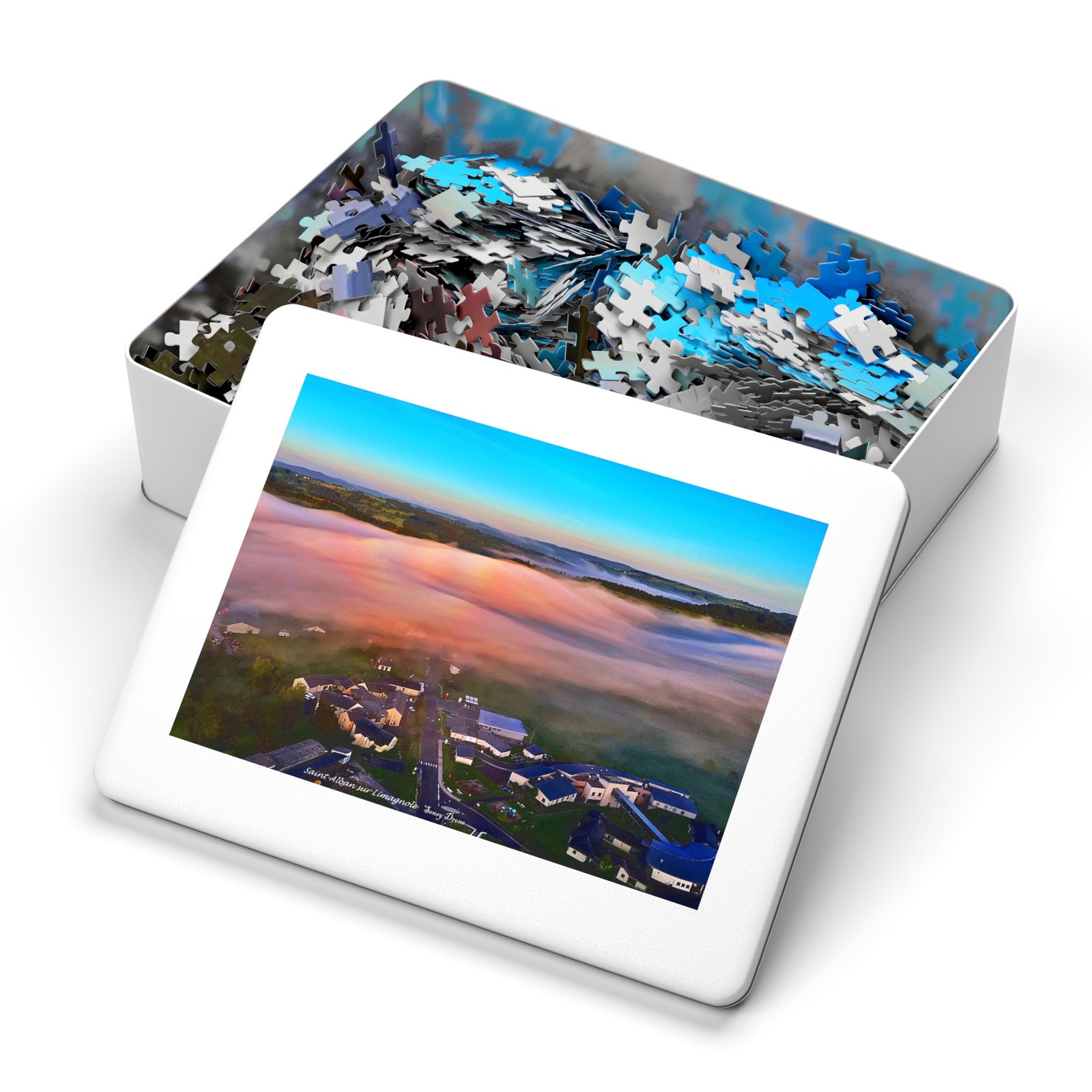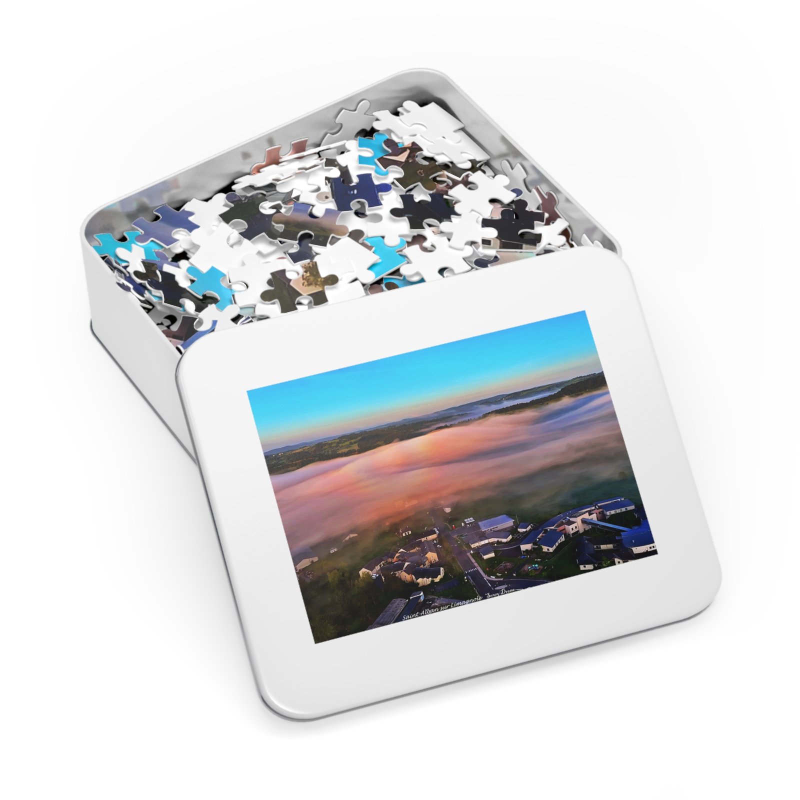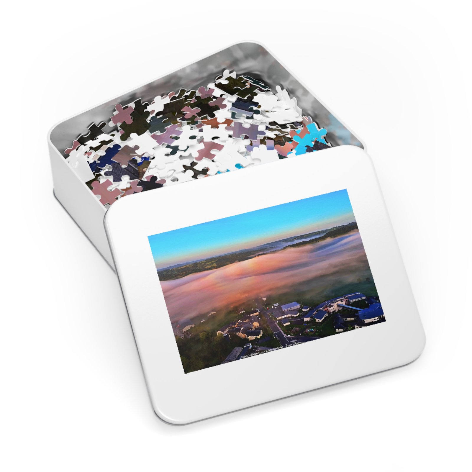 A tactile celebration of dawn over a misty campus — this metal-tin jigsaw invites slow, focused moments. The glossy print brings out the sunrise’s peach and sky-blue gradients, while the crisp chipboard pieces lock together smoothly. Work the edges into the warm fog, find the clusters of buildings, and watch the landscape resolve piece by piece. The tin keeps the puzzle safe between sessions and features the finished image so you always know what you’re building toward.