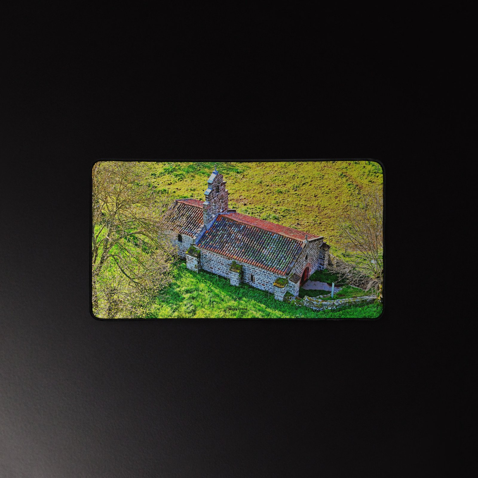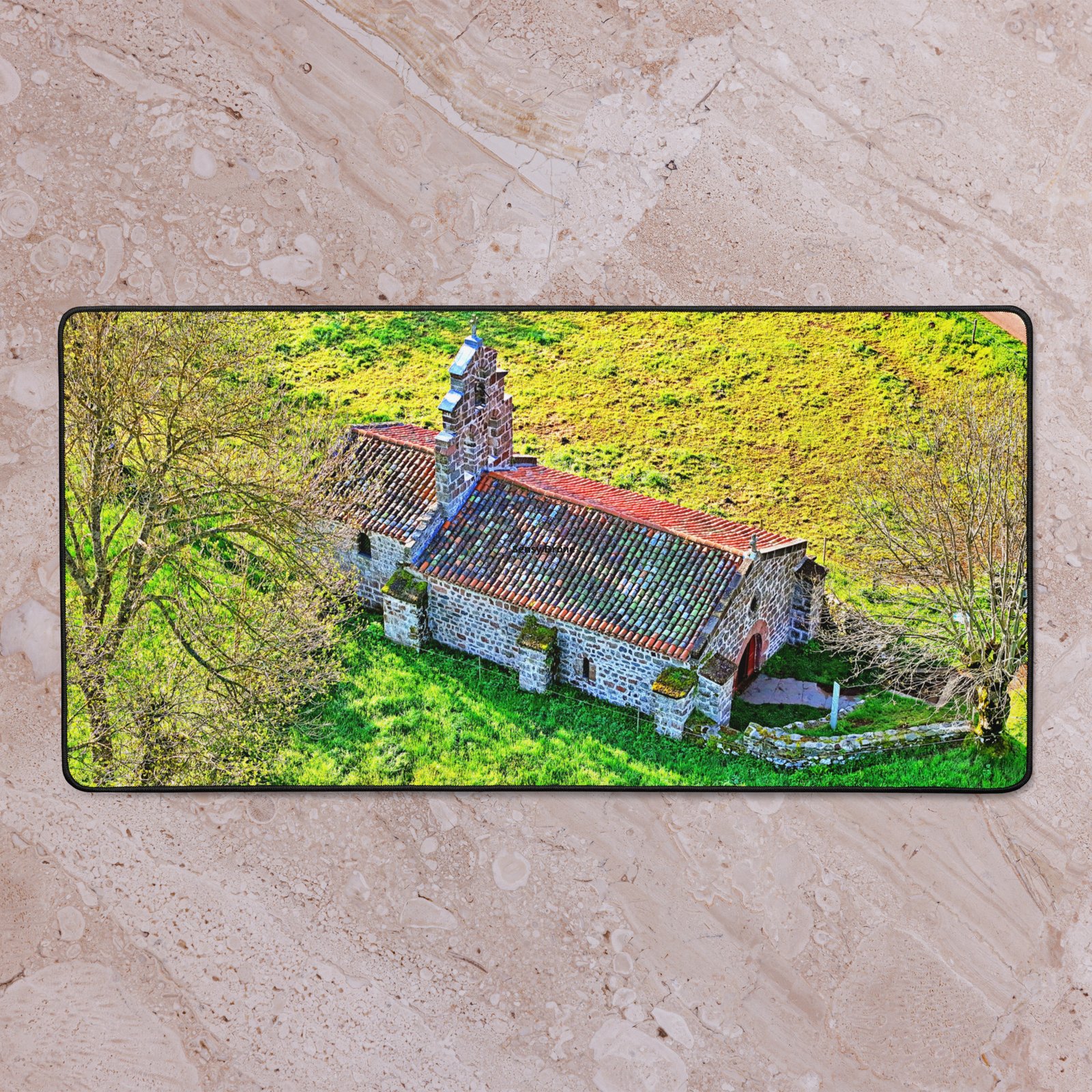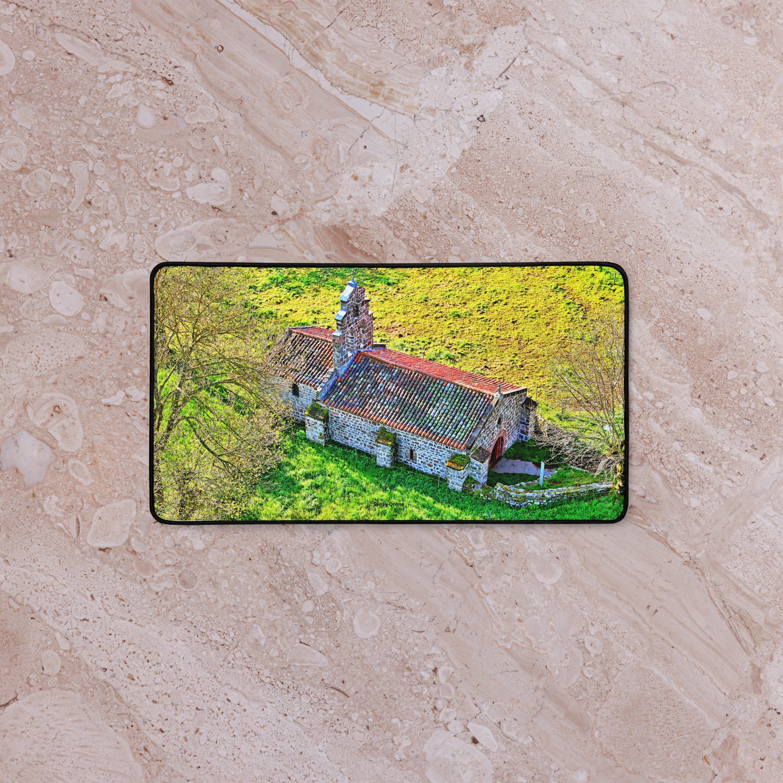 Posée au milieu des prés, la chapelle Saint-Roch de Montbonnet veille depuis le XIᵉ siècle sur les voyageurs et marcheurs. Lumière rasante, murs de pierre et herbe printanière : ce sous-main capture la quiétude du lieu et apporte une touche d’Auvergne à votre bureau. Visuel photographique original Sensy Drone. Conservez un bureau parfait avec un tapis lisse et antidérapant conçu pour le jeu ou le travail. Que vous jouiez, que vous travailliez ou que vous essayiez simplement d’empêcher votre tasse à café de se renverser, ce sous-main est là pour vous. Ce support antidérapant maintient votre configuration stable et ses bords cousus assurent sa résistance aux effets du temps !