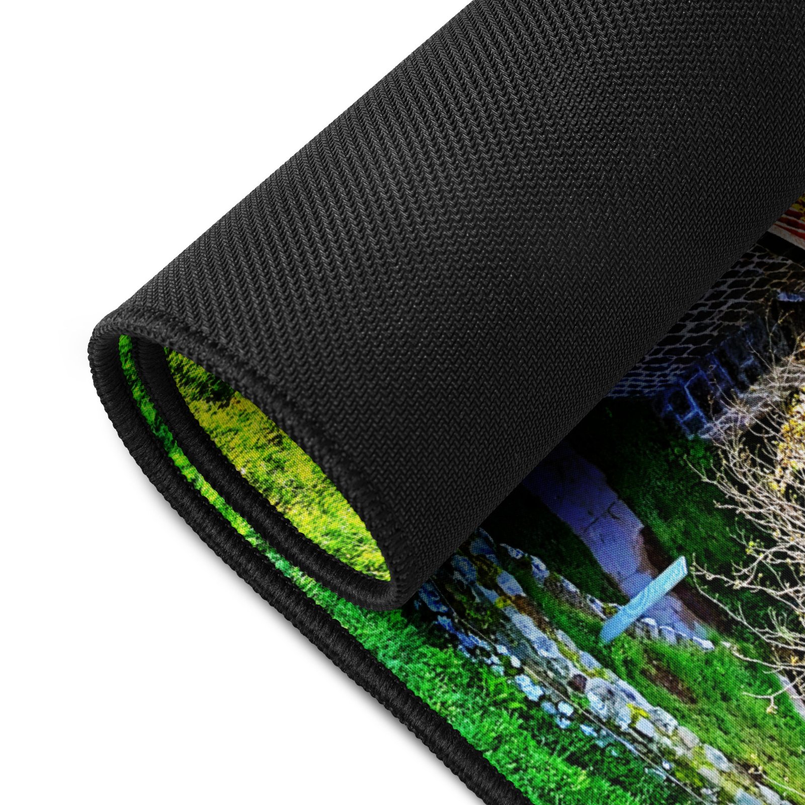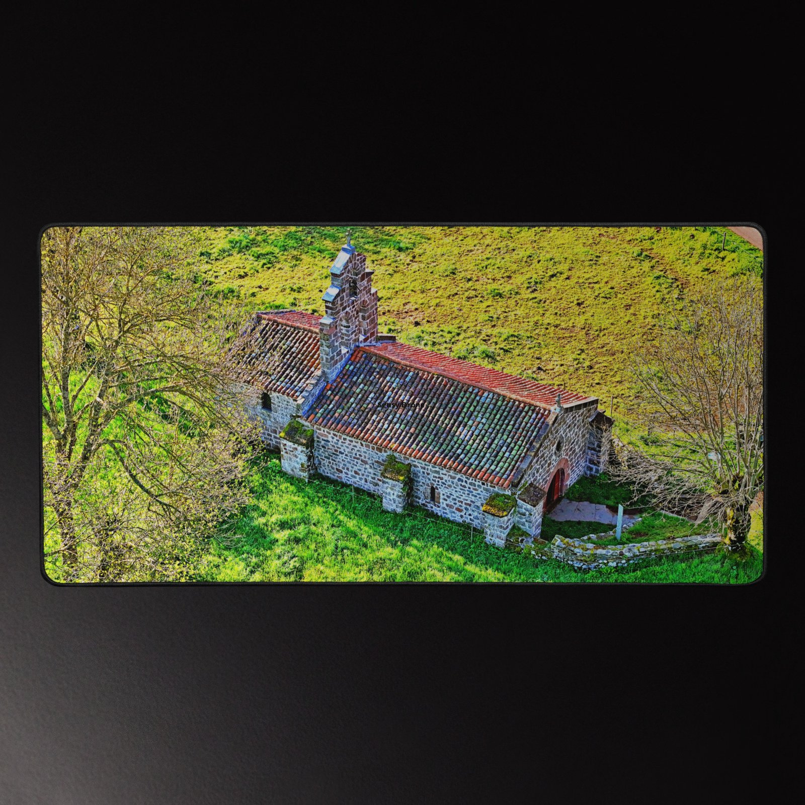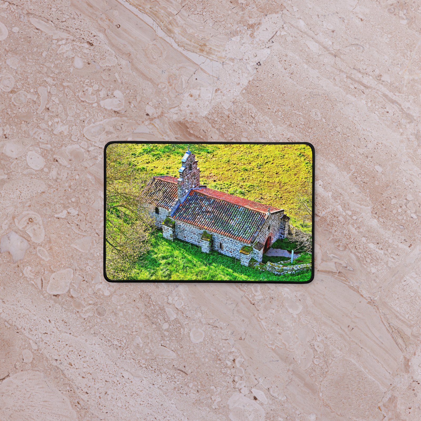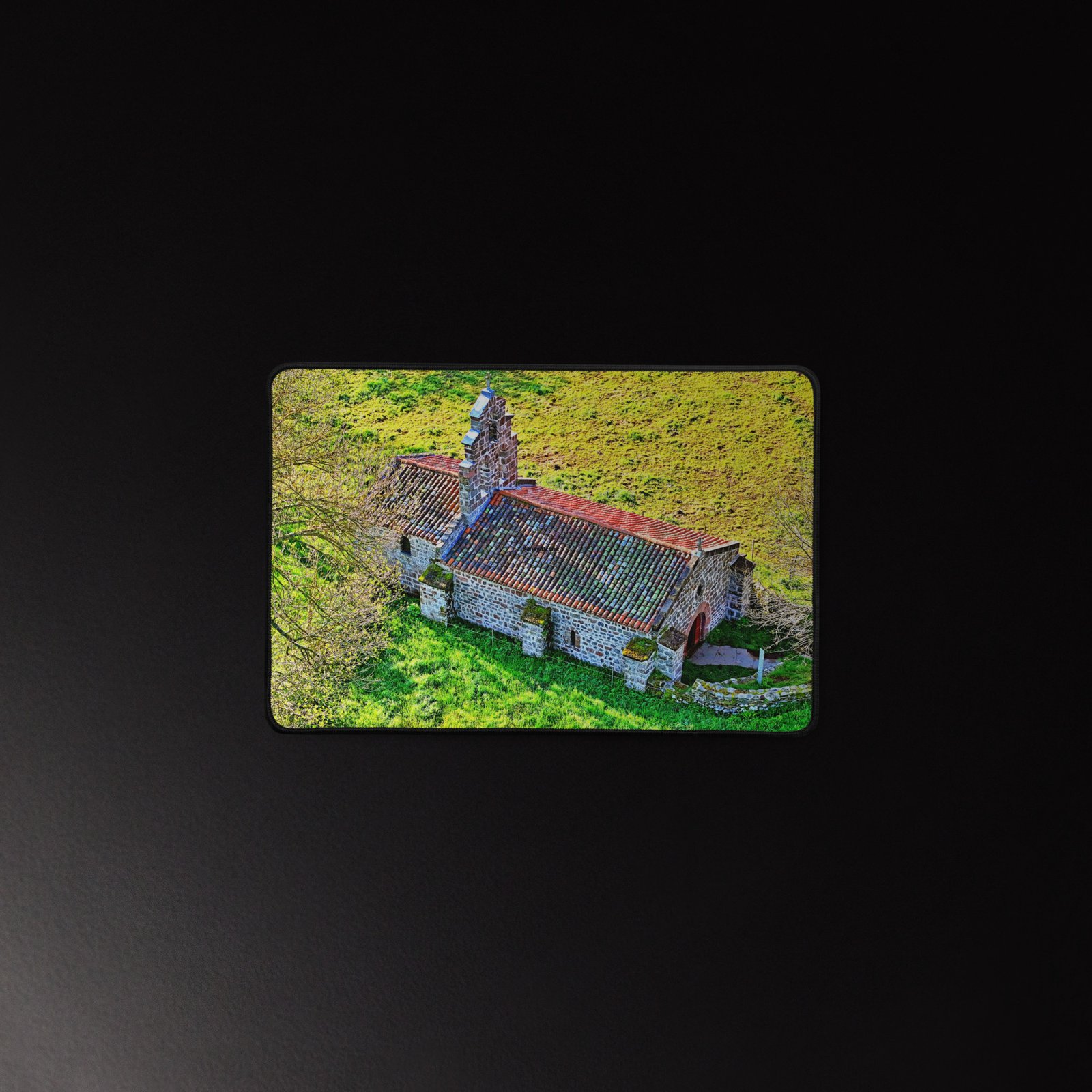 Posée au milieu des prés, la chapelle Saint-Roch de Montbonnet veille depuis le XIᵉ siècle sur les voyageurs et marcheurs. Lumière rasante, murs de pierre et herbe printanière : ce sous-main capture la quiétude du lieu et apporte une touche d’Auvergne à votre bureau. Visuel photographique original Sensy Drone. Conservez un bureau parfait avec un tapis lisse et antidérapant conçu pour le jeu ou le travail. Que vous jouiez, que vous travailliez ou que vous essayiez simplement d’empêcher votre tasse à café de se renverser, ce sous-main est là pour vous. Ce support antidérapant maintient votre configuration stable et ses bords cousus assurent sa résistance aux effets du temps !